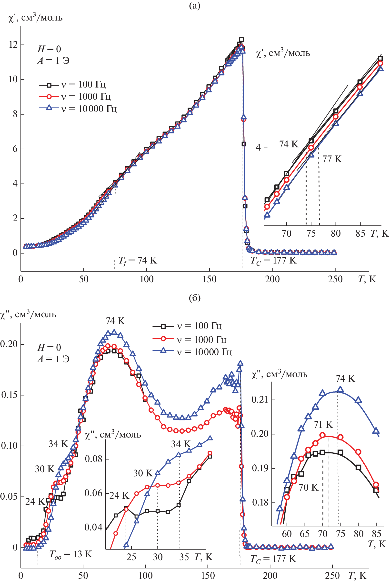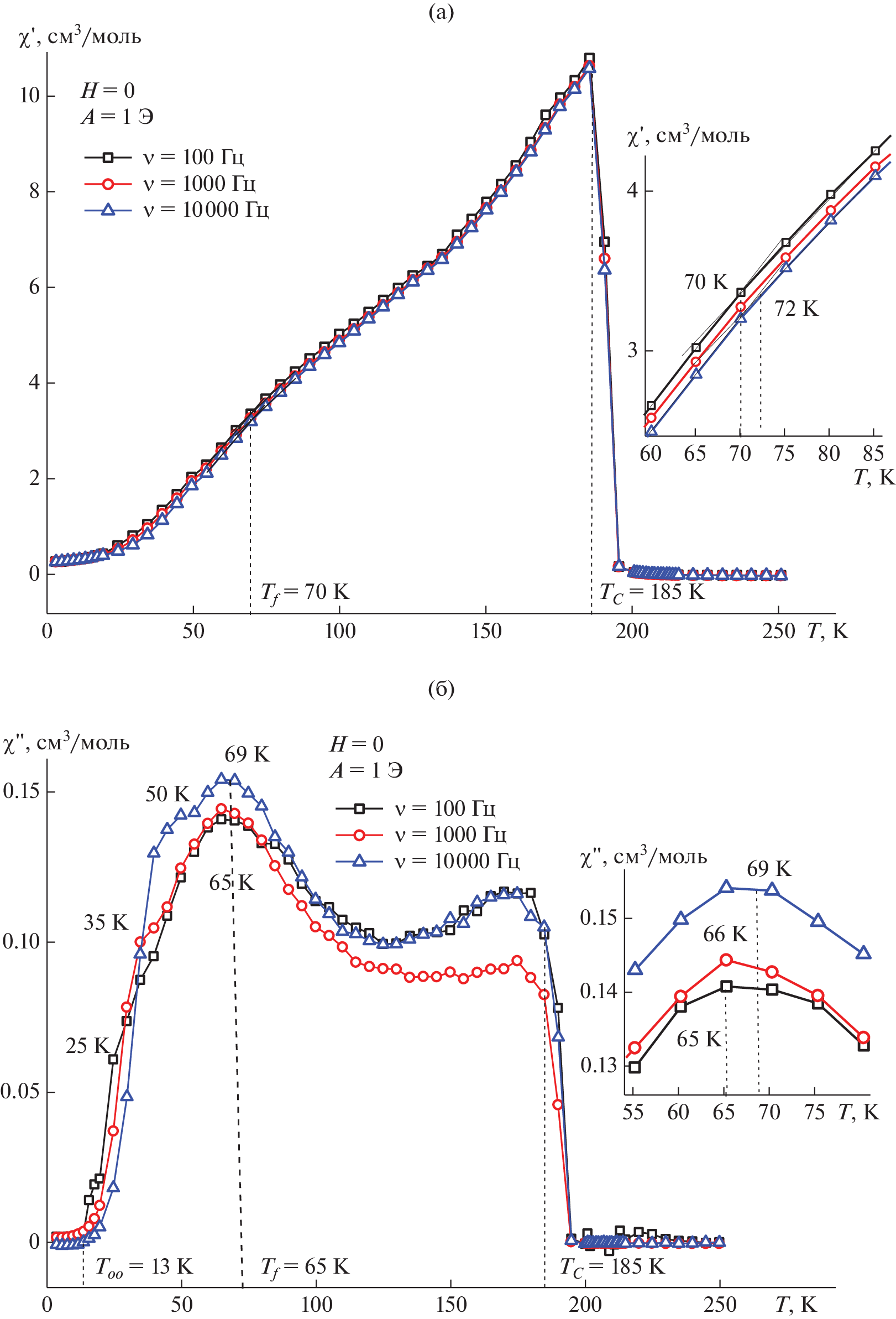 В работе статическим и динамическим методами исследована магнитная восприимчивость твердого раствора Fe1 – xCoxCr2S4 в системе FeCr2S4–СоCr2S4 для составов, прилегающих к FeCr2S4. Магнитные измерения проводили в температурном интервале 5–300 K в постоянном (50 Э и 45 кЭ) и переменном магнитных полях при амплитуде НАС = 1 Э и частотах переменного поля ν = 100, 1000 и 10000 Гц. Определены температуры и природа магнитных превращений в системе. Показано, что температура ферримагнитного перехода (ТС) в Fe1 – xCoxCr2S4 увеличивается с увеличением концентрации кобальта. Для составов с x = 0–0.5 обнаружено существование спинового стекла, подтвержденное сдвигом максимумов на кривых температурной зависимости мнимой части динамической восприимчивости.