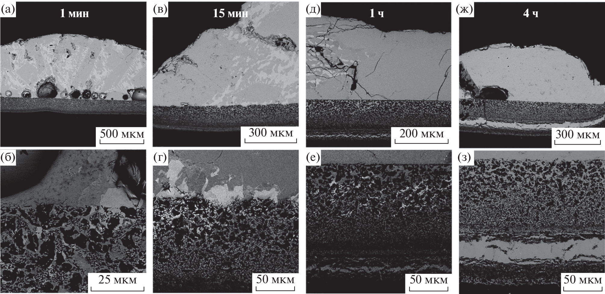 Исследовано взаимодействие в диффузионных па́рах иридий–карбид кремния при температурах 1500–1800°C с различным временем выдержки в условиях образования жидкости. Изучены микроструктура, фазовый и элементный составы диффузионной зоны, формирующейся при температурах выше образования эвтектик и/или плавления отдельных продуктов реакции – силицидов иридия. Показано, что микроструктура диффузионной зоны, формирующейся в условиях образования жидкости, отличается от той, которая формируется в условиях твердофазного взаимодействия между иридием и карбидом кремния. При температуре выше 1700°C содержание Si в расплаве Ir–Si становится больше 50 мол. %, что приводит к кристаллизации фаз Ir3Si4 и Ir3Si5 при охлаждении. Углерод, выделяющийся в ходе взаимодействия иридия с SiC, графитизируется с ростом температуры и времени выдержки.