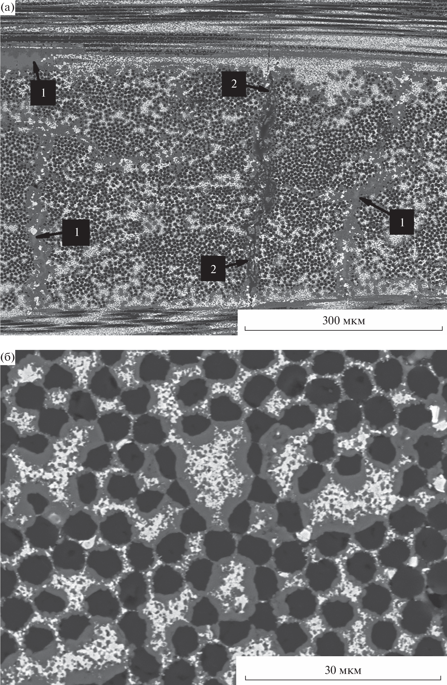 Предложен способ, позволяющий снизить температуру проведения жидкофазного силицирования при формировании керамических композитов с матрицей на основе карбида кремния и диборида циркония с помощью формирования легкоплавкой эвтектики кремния и иттрия. С помощью термодинамических расчетов проведено обоснование и показана целесообразность введения иттрия в силицирующий агент. Впервые проведено жидкофазное силицирование композитов при температуре ниже температуры плавления кремния, что привело к снижению степени деградации углеродного волокна и при этом позволило сохранить высокую плотность и однородность получаемой матрицы.