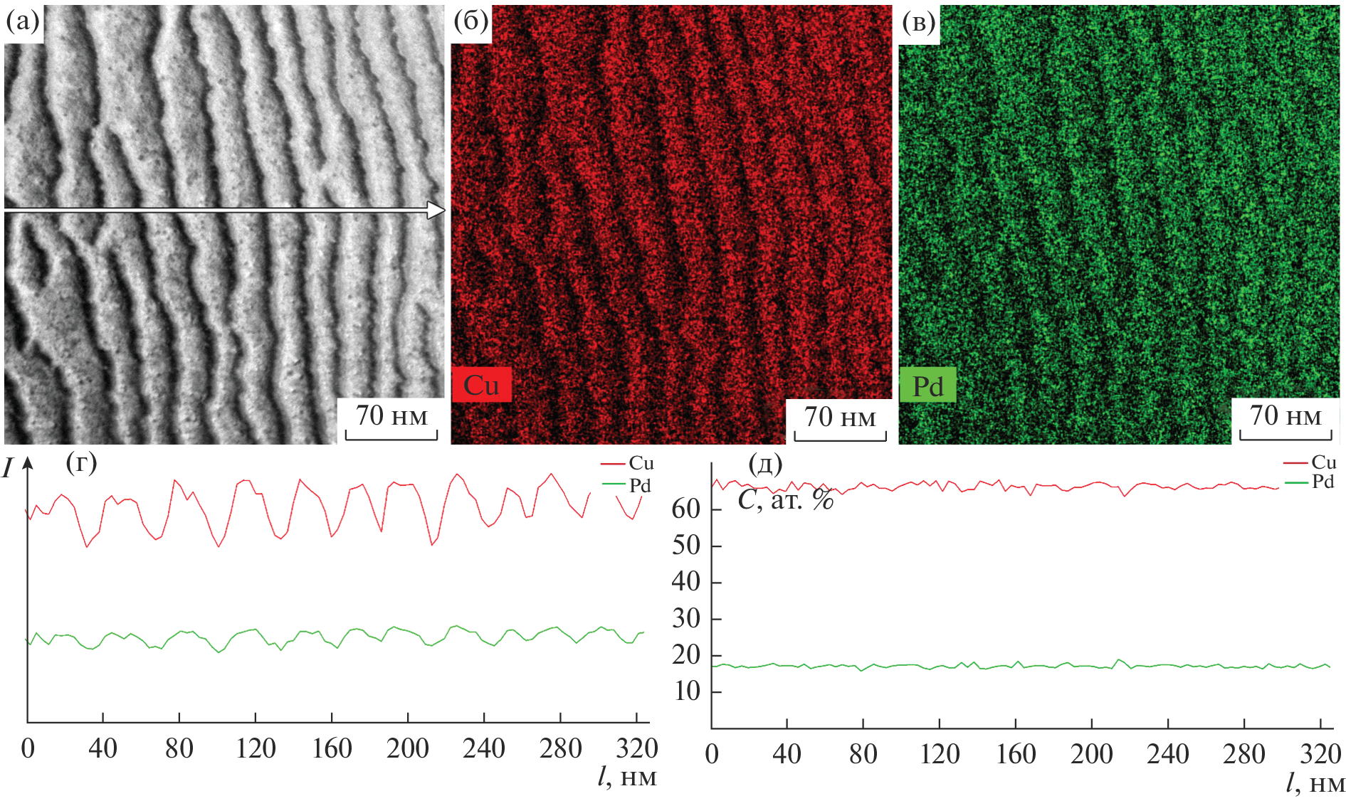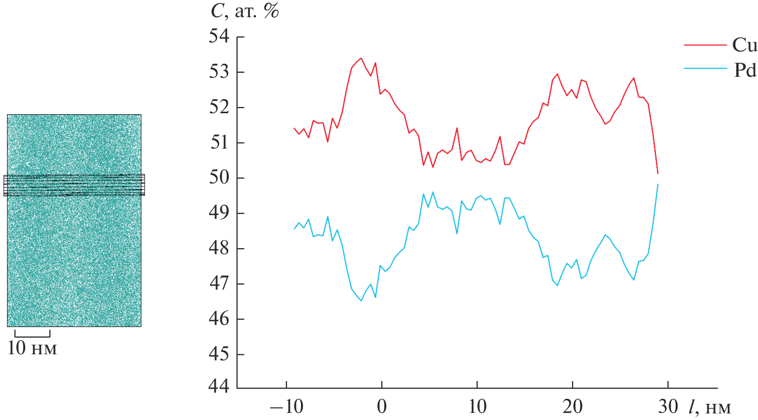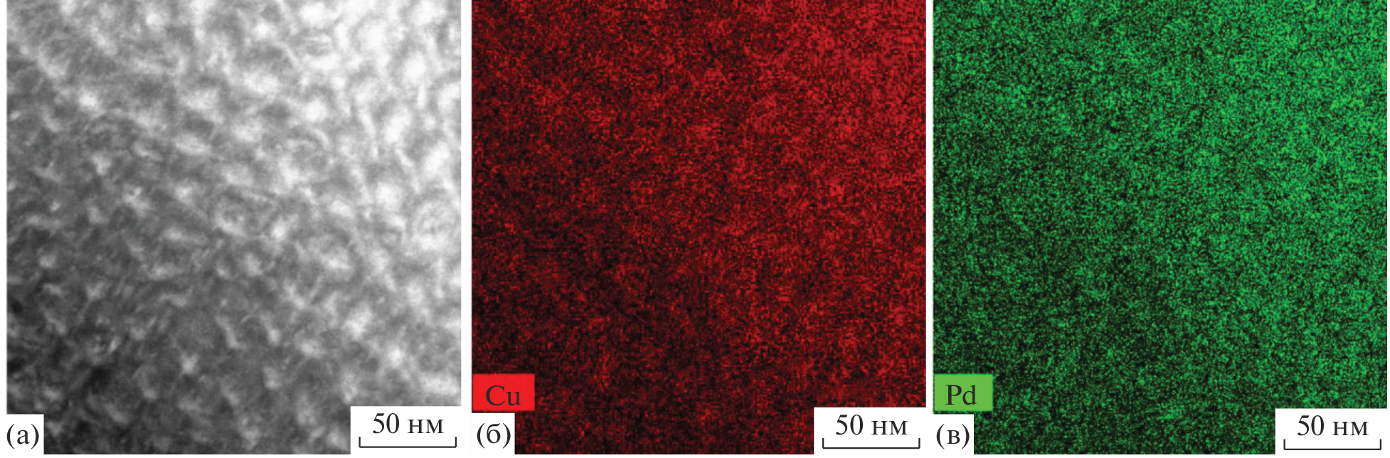 Современными методами высокоразрешающей просвечивающей электронной микроскопии исследованы изменения структуры твердого раствора Cu (51 ат. %)–Pd. Установлен характер концентрационного расслоения неупорядоченного твердого раствора. Результаты могут быть положены в обоснование малой скорости процесса упорядочения при приближении состава к эквиатомному.