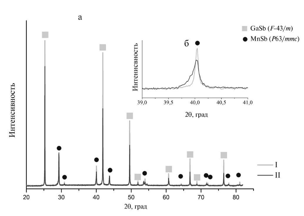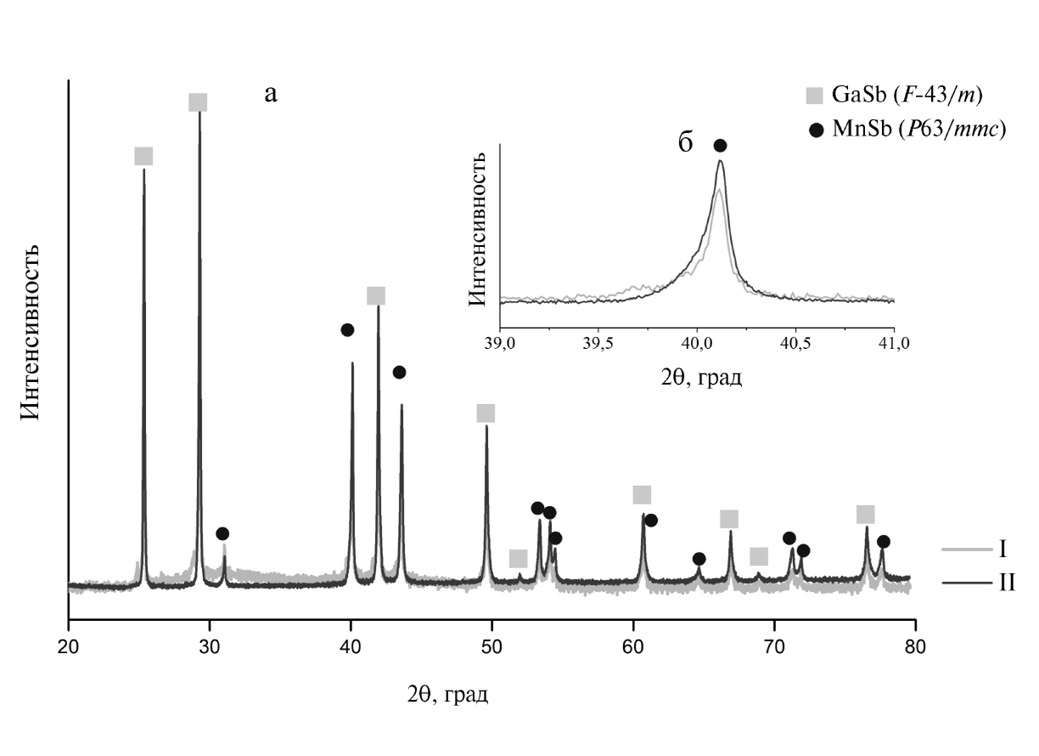 Синтезированные композиты были идентифицированы с помощью РФА. На рис. 1 представлены рентгенограммы образцов состава 59 мол. % GaSb–41 мол. % MnSb, полученных при разных скоростях охлаждения: I – vохл = 0.1°С/с, II – vохл = 60°С/с.