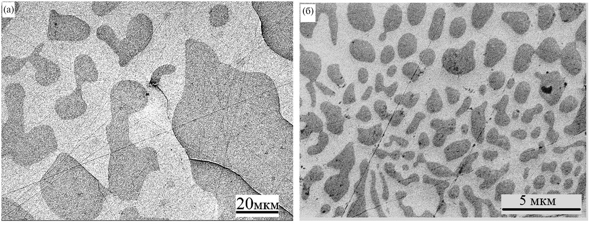 Микроструктурные исследования дополняли результаты РФА, а также подтверждали эвтектический характер взаимодействия в системе GaSb–MnSb и влияние скорости охлаждения расплава на размер кристаллитов антимонида марганца. На рис. 3 представлены микроструктуры образцов состава 59 мол. % GaSb–41 мол. % MnSb, полученных при разных скоростях охлаждения: vохл = 0.1°С/с (а), 60°С/с (б). В случае vохл = 0.1°С/с средний размер кристаллитов антимонида марганца составлял ~7 мкм, при vохл = 60°С/с – ~0.6 мкм.