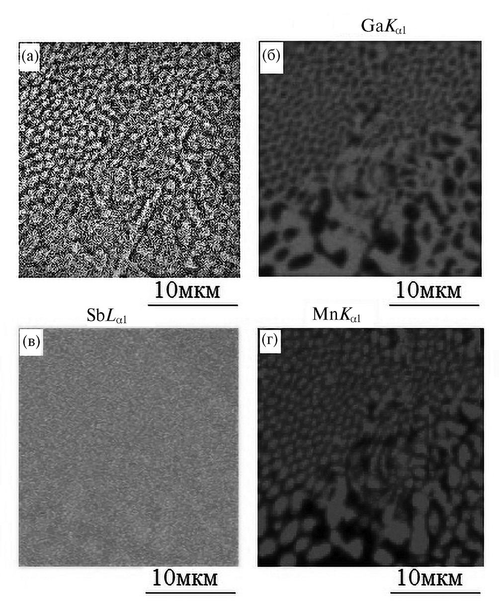 Эвтектический характер взаимодействия в системе GaSb–MnSb хорошо подтверждает рис. 4, на котором представлена микроструктура закаленного образца состава 59 мол. % GaSb–41 мол. % MnSb с элементным картированием. Такой вид микроструктуры типичен для эвтектики ламинарного типа.