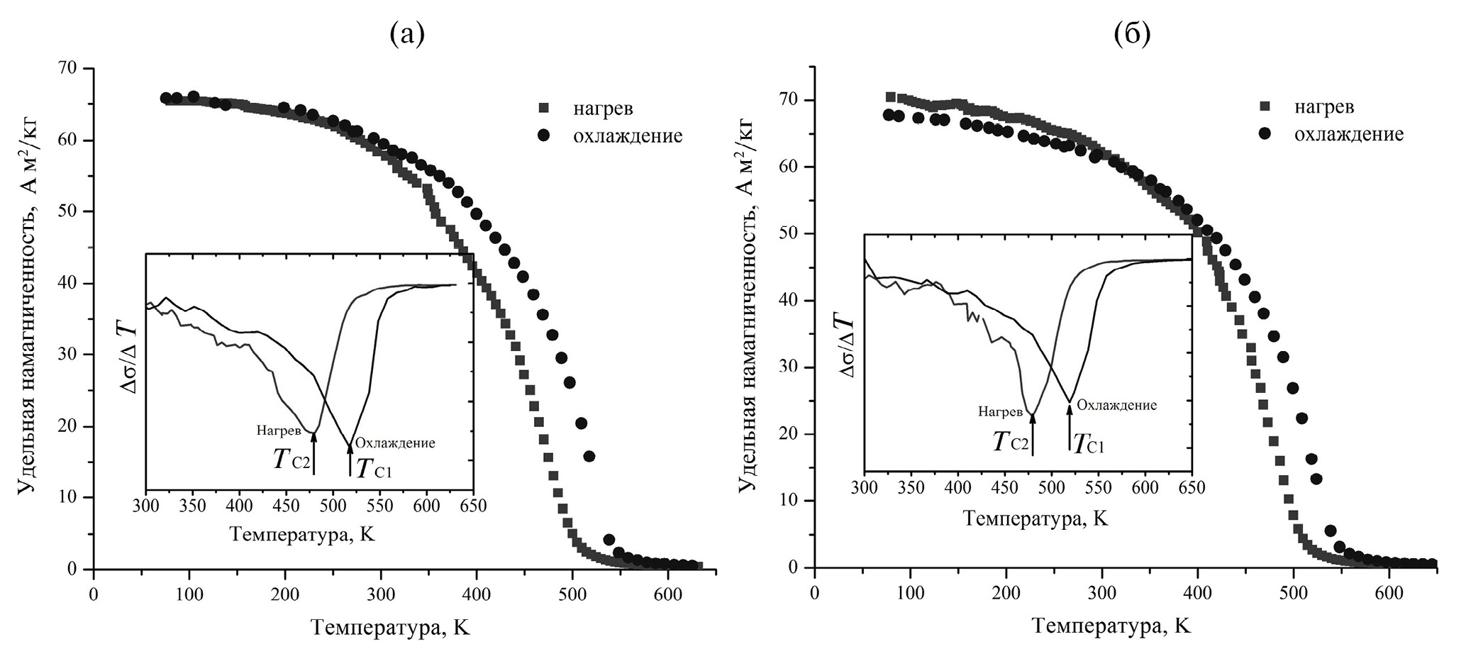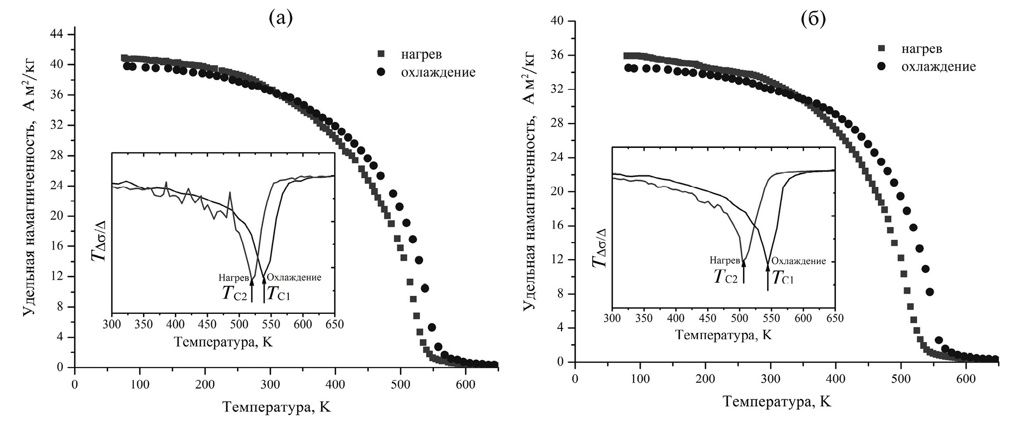 Известно, что температура Кюри ферромагнитного MnSb составляет порядка 600 К [15]. В композитных сплавов она ниже, в нашем случае температуру Кюри определяли по максимуму первой производной температурной зависимости намагниченности (Δσ/ΔT) в режиме как нагрева, так и охлаждения (см. вставки на рис. 5 и 6). В режиме нагрева она всегда ниже, что обусловлено стабилизацией магнитных кластеров. Для закаленных образцов температура Кюри была выше и составляла 519 К для состава 30 мол. % GaSb–70 мол. % MnSb и 544 К для 59 мол. % GaSb–41 мол. %MnSb. Величина удельной намагниченности при температуре жидкого азота для закаленных образцов составляет 70.40 и 36.00 A м2/кг соответственно, что связано с увеличением доли магнитных кластеров MnSb.