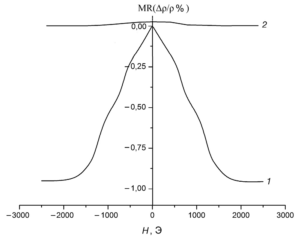 Рис. 7. Магнетосопротивление композитов при Т = 300 K: 1 – 70 мол. % MnSb, 2 – 41 мол. % MnSb