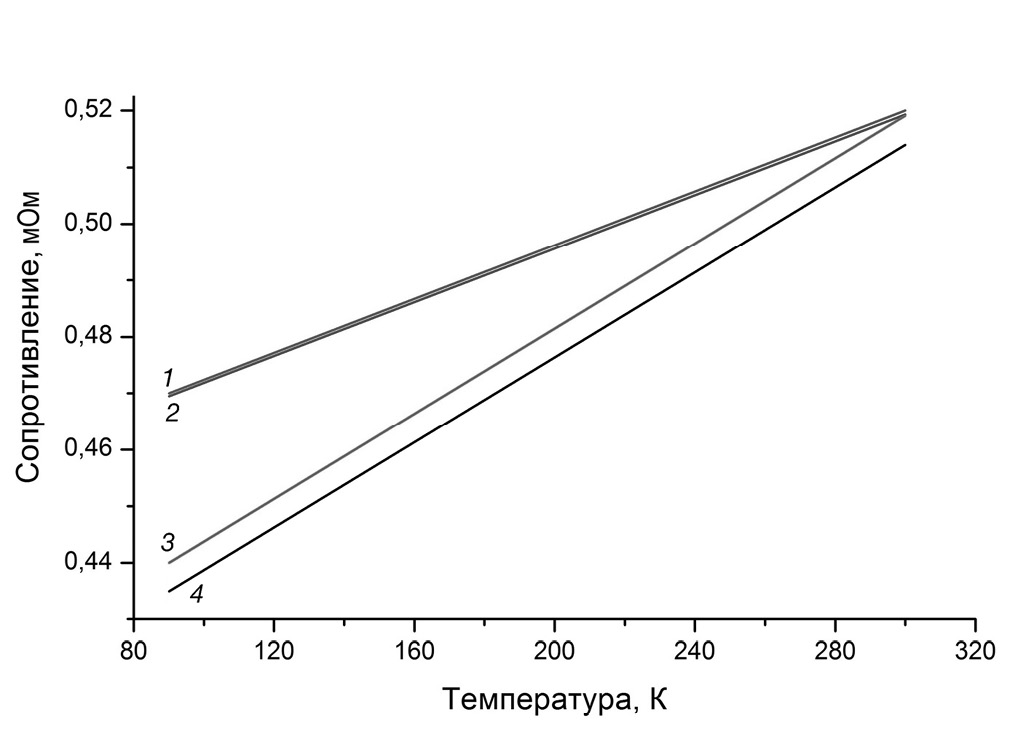 Рис. 8. Температурные зависимости электрического сопротивления в интервале температур 85–300 К композитов 30 мол. % GaSb–70 мол. % MnSb (1, 2), 59 мол. % GaSb–41 мол. % MnSb (3, 4), полученных при vохл = 60°/с без магнитного поля (1, 3) и в магнитном поле 0.27 Тл (2, 4). 30мол % GaSb–70 мол % MnSb (1, 2); 59 мол % GaSb – 41 мол % MnSb (3, 4)