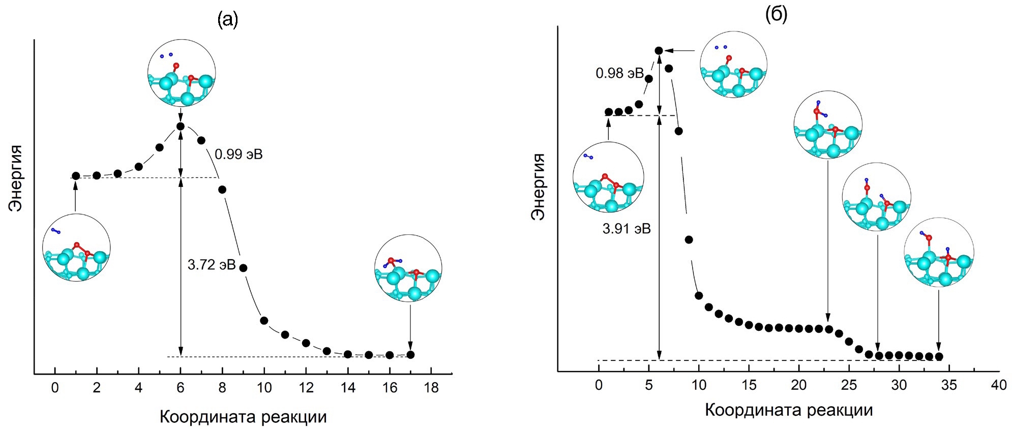 Энергия активации. Переходное состояние между реагентами и продуктами реакций (2) и (3) (см. также рис. 2) определяется с помощью модифицированного метода упругой ленты [16]. Этот расчет дает энергию активации Ea (разность энергий между начальным и переходным состояниями) и тепловой эффект реакции ΔE (разность энергий между начальным и конечным состояниями):