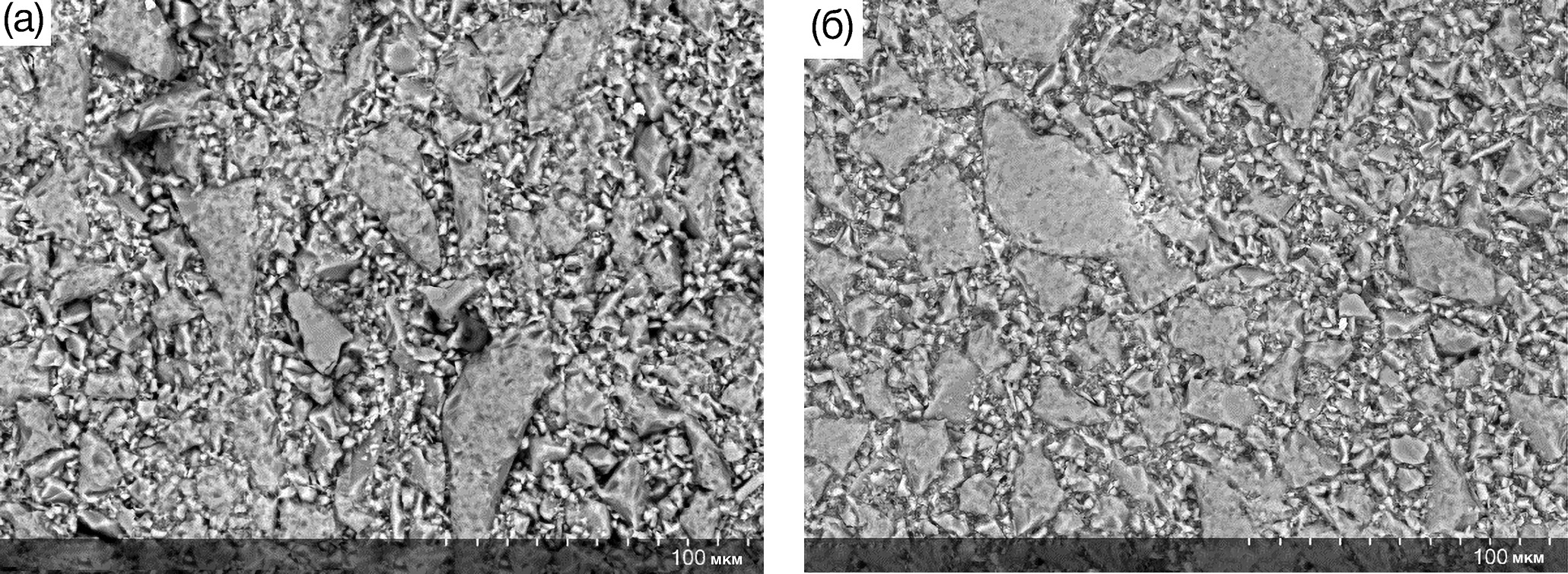 На рис. 3 представлены микрофотографии микроструктуры керамических образцов, наномодифицированных волокнами Al2O3 и не содержащих волокон. Установлено, что размер зерен изменяется от ≤1.0 до ~100 мкм, плотность керамики составляет 1.85–1.90 г/см3, пористость – 9.0–12.0%. Методом рентгенофазового анализа установлено, что содержание кристобалита не превышало 5 мас. %.