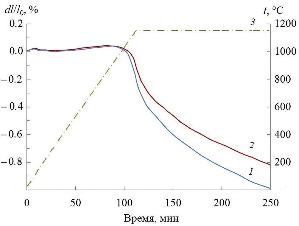 Рис. 5. Кривые спекания кварцевой керамики с добавкой 0.15 мас. % нановолокон Al2O3 (1) и без добавки (2), график изменения температуры (3)