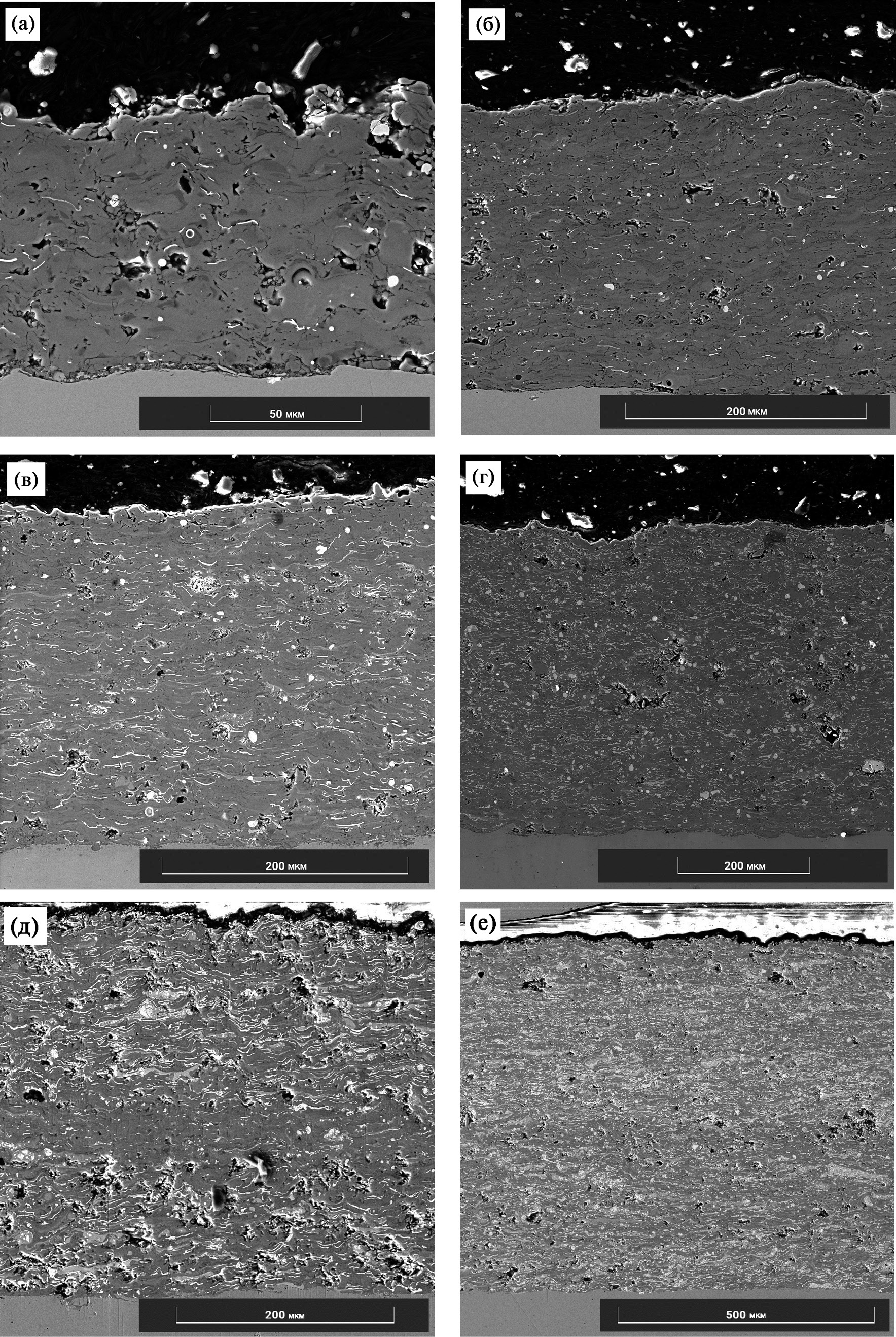Рис. 8. Микрофотографии композиционных покрытий Ti/HfB2 с содержанием HfB2 (мас. %): а – 10, б – 20, в – 30, г – 40, д – 50, е – 60