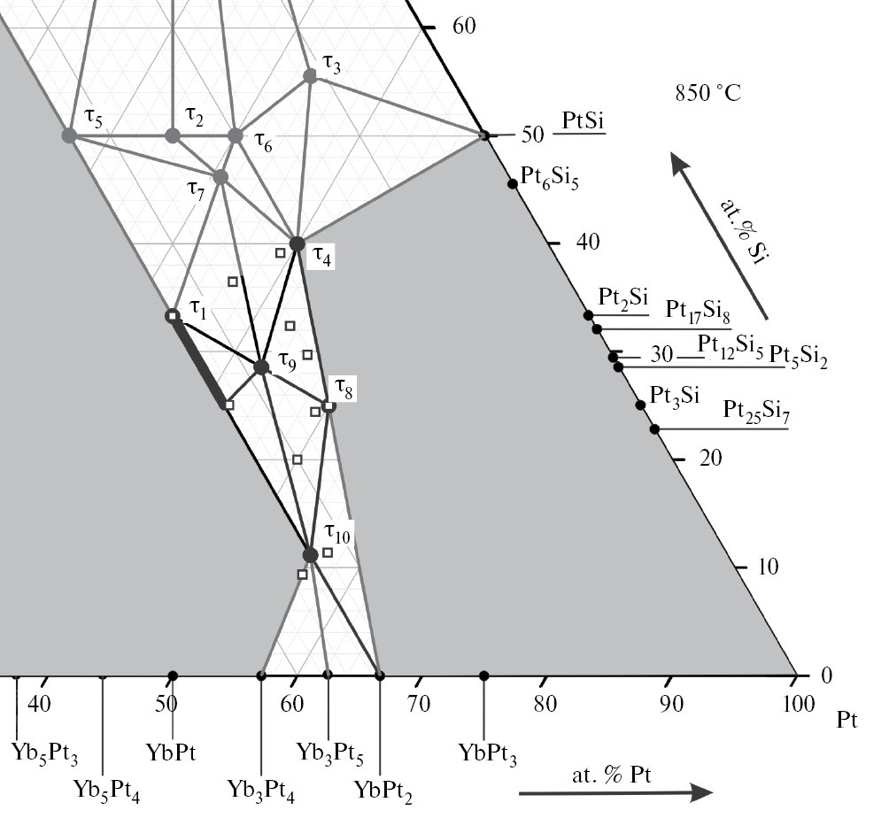 В этой работе таким этапом стал поиск новых соединений иттербия, определение их кристаллических структур и фазовых равновесий в тройной системе Yb–Pt–Si в концентрационной области, ограниченной содержанием кремния от 0 до 42 ат. % и иттербия от 20 до 43 ат. %.