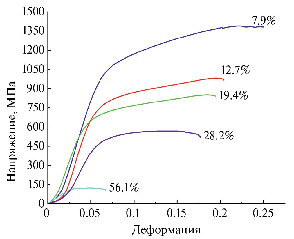 На рис. 6 приведены диаграммы деформирования образцов с разной пористостью, спеченных при 1200 °С в аргоне. Видно, что предел прочности на сжатие уменьшается на порядок при увеличении пористости от 7.9 до 56.1%. Сильно уменьшается пластичность (рис. 7), причем очевидно, что она связана с пористостью линейным законом.