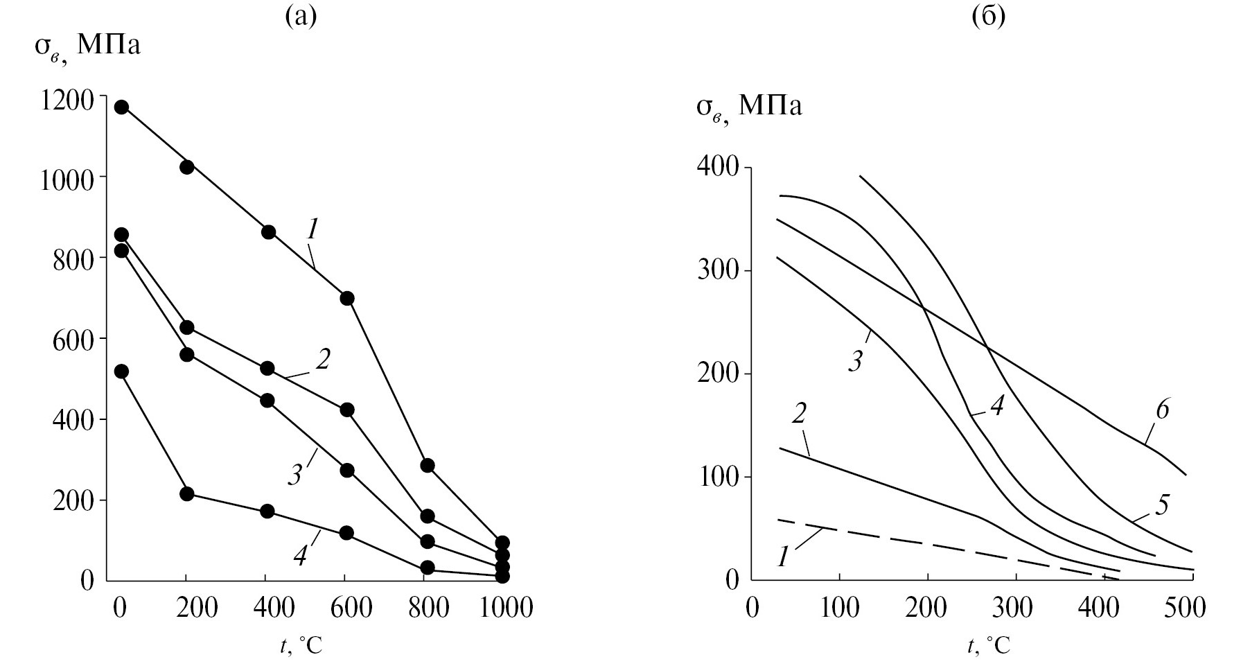 Рис. 1. Температурные зависимости прочности титановых сплавов: 1 – ВТ3-1, 2 – ВТ5-1, 3 – ОТ4, 4 – ВТ1-0 (а) и алюминиевых сплавов: 1 – чистый, 2 – технический, 3 – АМг3, 4 – АМг6, 5,6 – САПы [1] (б)