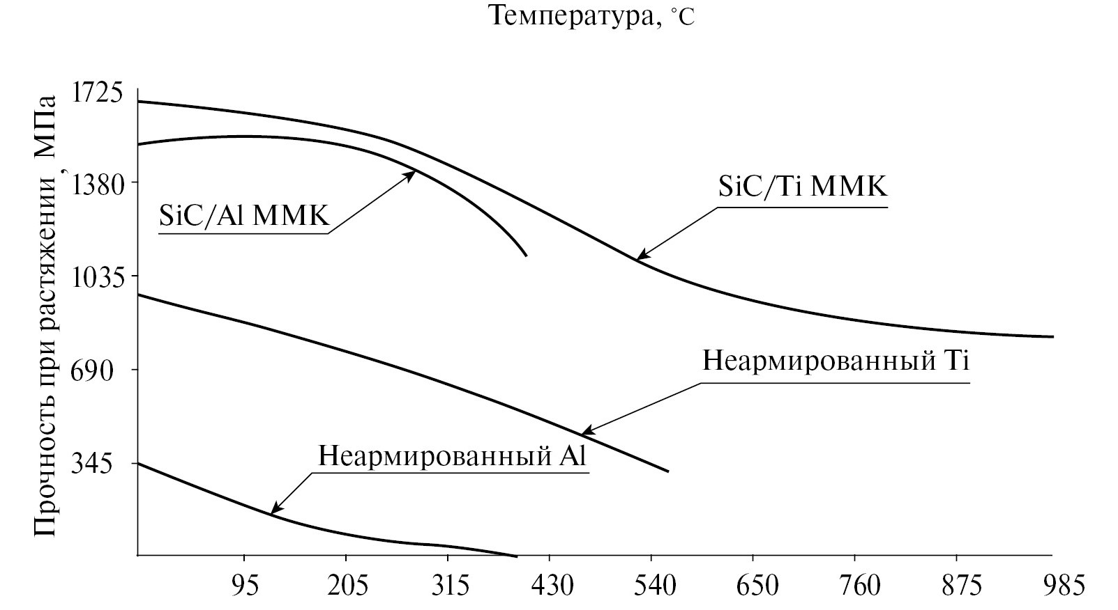 Рис. 2. Температурные зависимости прочности при растяжении для МКМ, армированных керамическими высокотемпературными волокнами и без армирования [2]