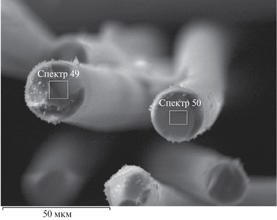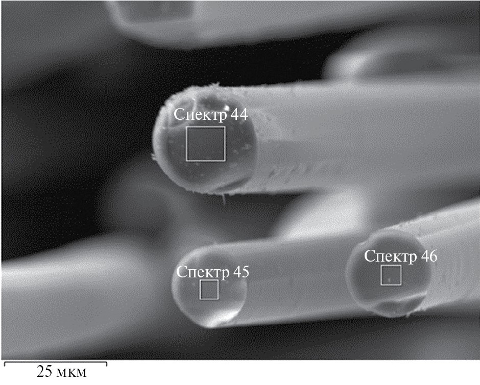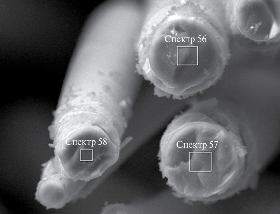 Полученные SiCN-волокна исследовали на сканирующем электронном микроскопе (СЭМ). Для подтверждения химического состава волокон использовали результаты локального рентгеноспектрального анализа (рис. 3–5 и табл. 2–4).