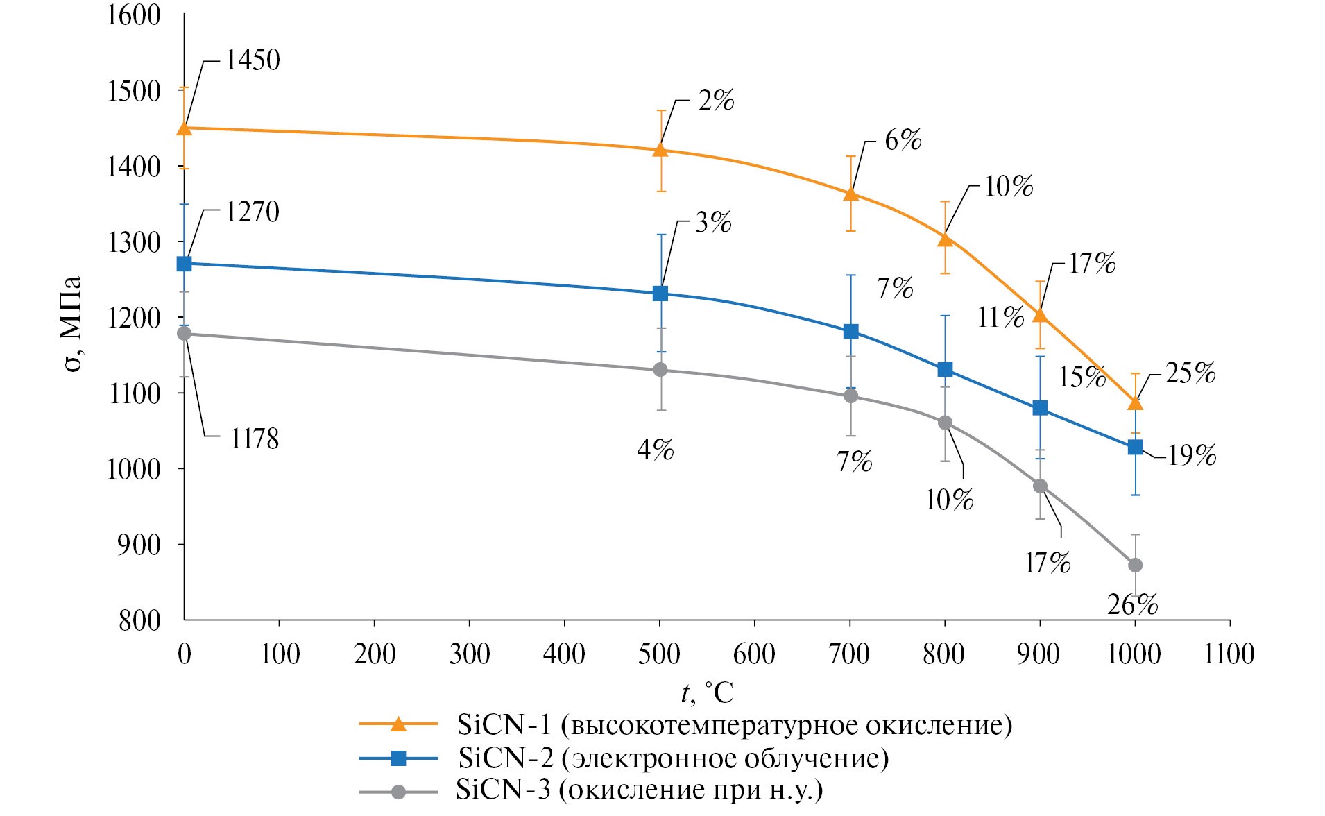 После термообработки при 500 °C в окислительной среде наблюдается незначительное снижение прочностных характеристик волокон всех типов отверждения, при этом образец SiCN-1 показывает наименьшую потерю прочности. В температурном интервале 500–800 °C окисленные волокна SiCN-1 демонстрируют несколько лучшие прочностные свойства, чем волокна, отвержденные электронным облучением.