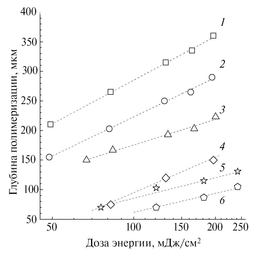Трехмерная печать и ее результаты. Зависимости глубины полимеризации суспензий от дозы излучения строили в полулогарифмических координатах и аппроксимировали уравнением Джейкобса (рис. 3):