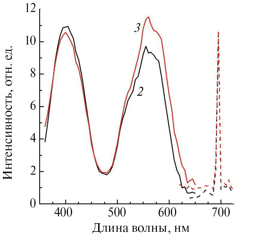 Спектры ФЛ и спектры возбуждения для 3D-керамики Al2O3:Cr3+ представлены на рис. 5. На спектрах возбуждения видны широкие полосы в синей и зеленой областях спектра, на спектрах ФЛ виден острый и интенсивный пик при ~694 нм, что типично для активаторного иона Cr3+ в матрице α-Al2O3. В основании доминантного R-пика видно несколько слабых пологих линий при 670, 706 и 714 нм [4, 6]. Время затухания ФЛ, определенное по одноэкспоненциальным кривым затухания (рис. 6), составило 3.679(1) и 3.757(3) мс для образцов 2 и 3 соответственно. Таким образом, время затухания при увеличении концентрации Cr3+ незначительно возрастает и оба значения в целом близки к данным [4, 6]. Фосфоресценция в образцах керамики не обнаружена.