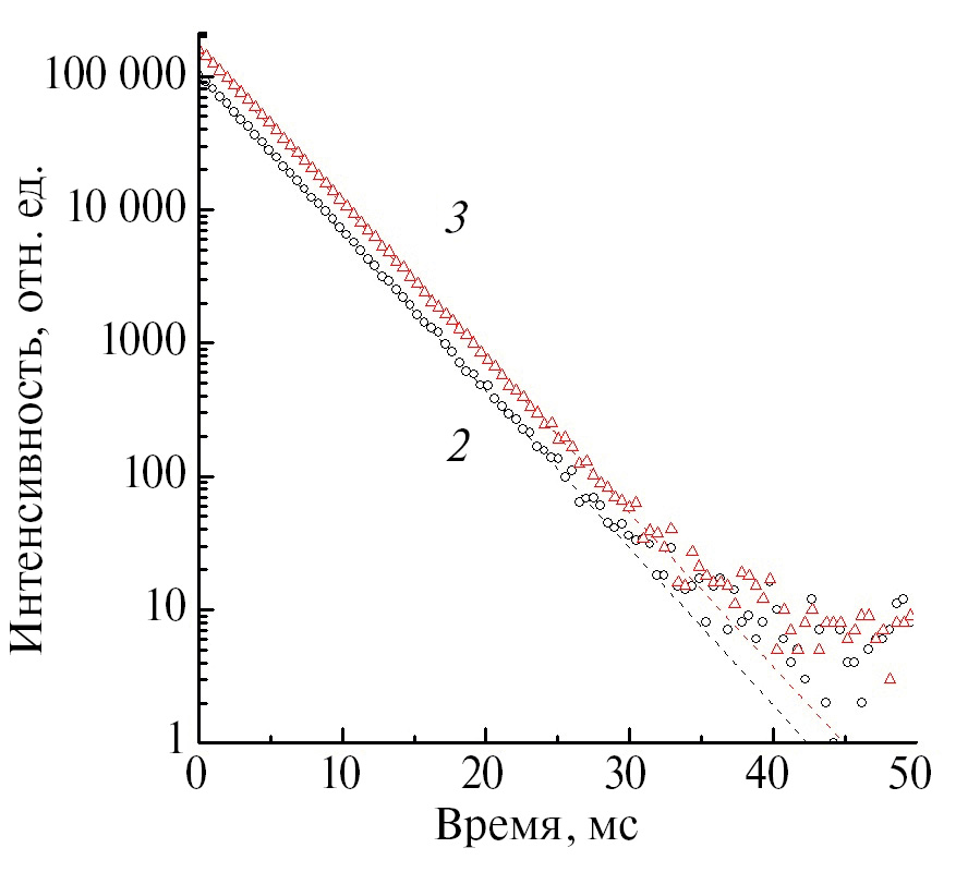 Рис. 6. Кинетика затухания ФЛ керамики Al2O3:Cr3+ при λрег = 694 нм и λвозб = 403 нм: черные круги и красные треугольники – экспериментальные данные для образцов 2 и 3 соответственно, штрихпунктирные линии – их одноэкспоненциальное описание