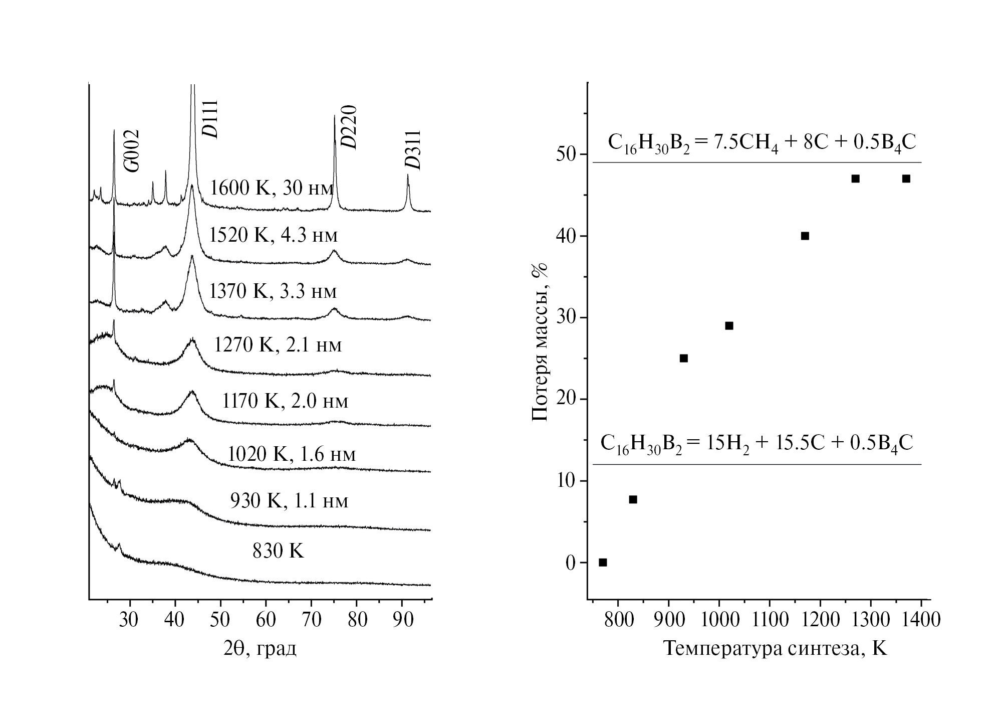 На рис. 1а представлены дифрактограммы синтезированных образцов, а на рис. 1б – потери массы образцов после синтеза. Из графика зависимости потери массы от температуры следует, что разложение прекурсора начинается в интервале температур 770–830 K. При температурах синтеза 830–1020 K на рентгеновских дифрактограммах образцов обнаруживаются широкие особенности на 44° и 76°. Принимая во внимание отсутствие широкого пика при 26° от графитоподобных структур и с учетом дальнейшей эволюции дифрактограмм, мы трактуем данные особенности как свидетельство зарождения наноалмазов при разложении прекурсора. Можно предположить, что на начальном этапе пиролиза происходит полимеризация молекул, приводящая к образованию кластеров с алмазоподобной структурой. Присутствие таких кластеров может существенно снизить потенциальный барьер образования алмазного зародыша. Недавно было экспериментально показано, что углеводородный кластер с 22–26 атомами sp3-углерода способен стабильно расти в углеводородной среде [10]. Рост кластера до размеров классического зародыша объясняется меньшим химическим потенциалом углерода на насыщенной водородом поверхности по сравнению с компонентами ростовой среды.