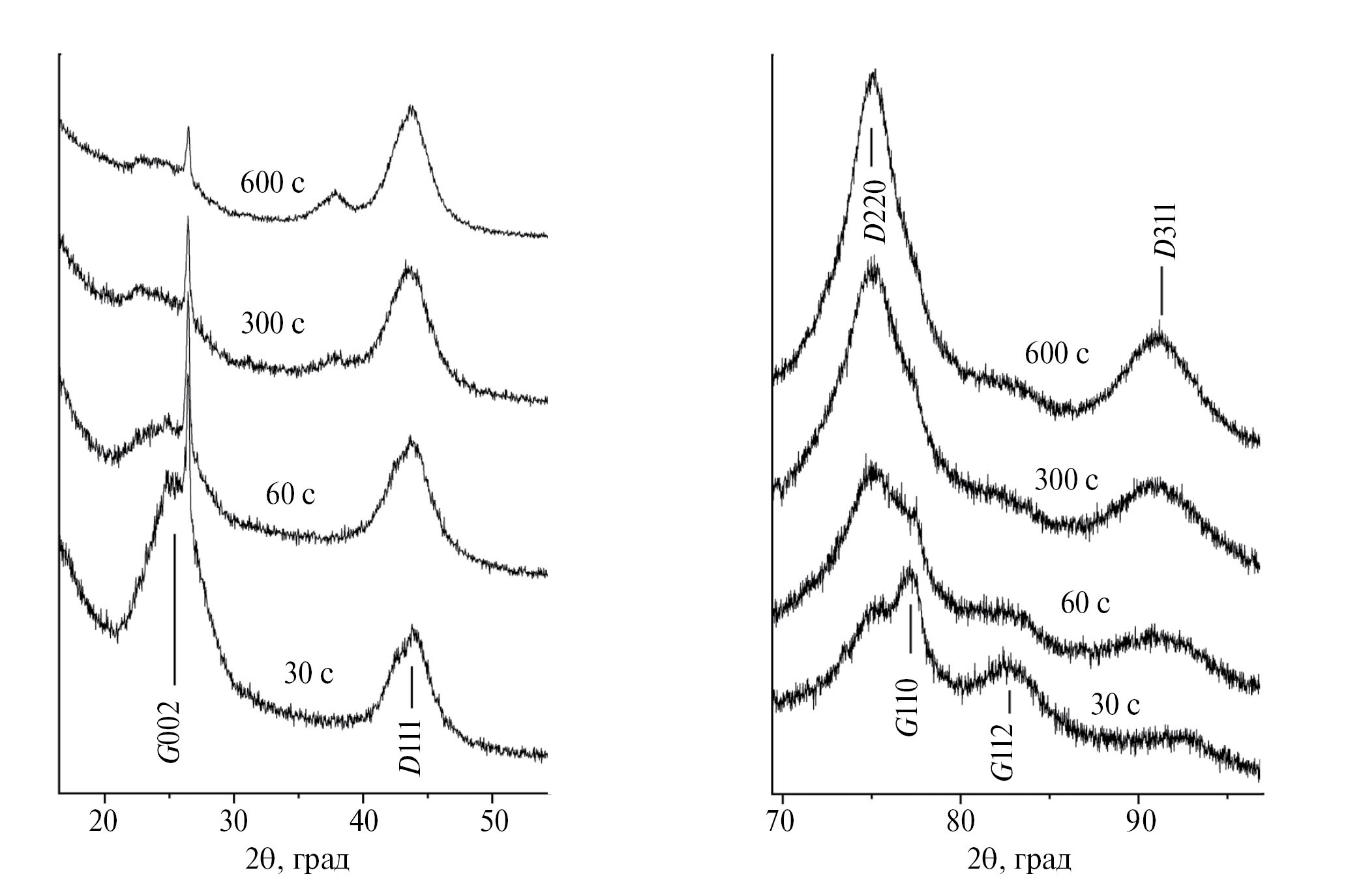 Для выявления особенностей трансформации sp2sp3 нанокристаллической смеси мы исследовали влияние времени синтеза при температуре 1270 K на фазовый состав образцов (рис. 3). Результаты анализа дифрактограмм с использованием метода Ритвельда позволили охарактеризовать эволюцию наноструктуры и кинетику превращения. На рис 4 представлены зависимости массовой доли и размера кристаллитов графитоподобной и наноалмазной фаз от времени синтеза (образование сопутствующих фаз не принималось в расчет). Размеры кристаллитов оценивались по пикам 220 алмаза и 002 графита. Степень превращения нанографита в наноалмаз хорошо коррелирует со средним размером нанокристаллов алмаза, что в целом соответствует ростовому процессу. Отметим, однако, что рост наноалмазов ограничен размерами графеновой оболочки, окружающей «алмазный» кластер.