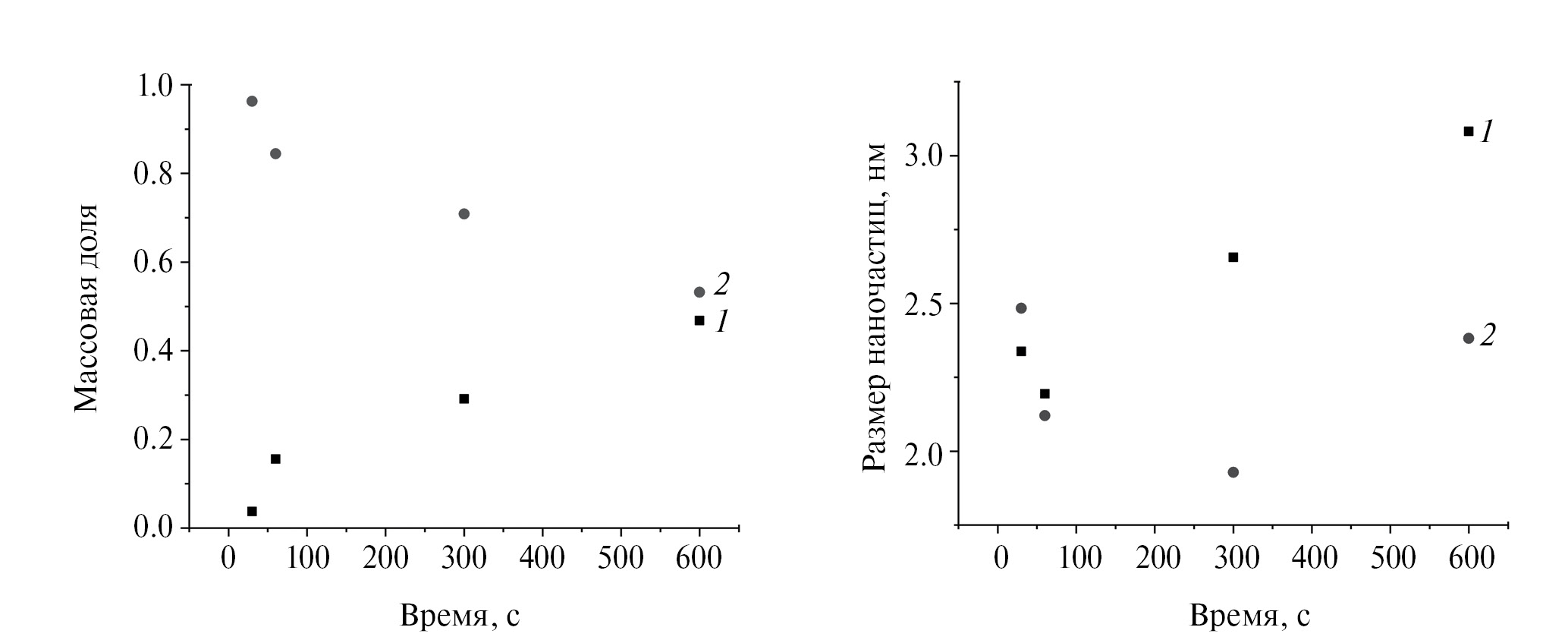 5. Рис. 4. Зависимости массовой доли (а) и размеров кристаллитов (б) нанографита (2) и наноалмаза (1) от времени синтеза при температуре 1270 K.