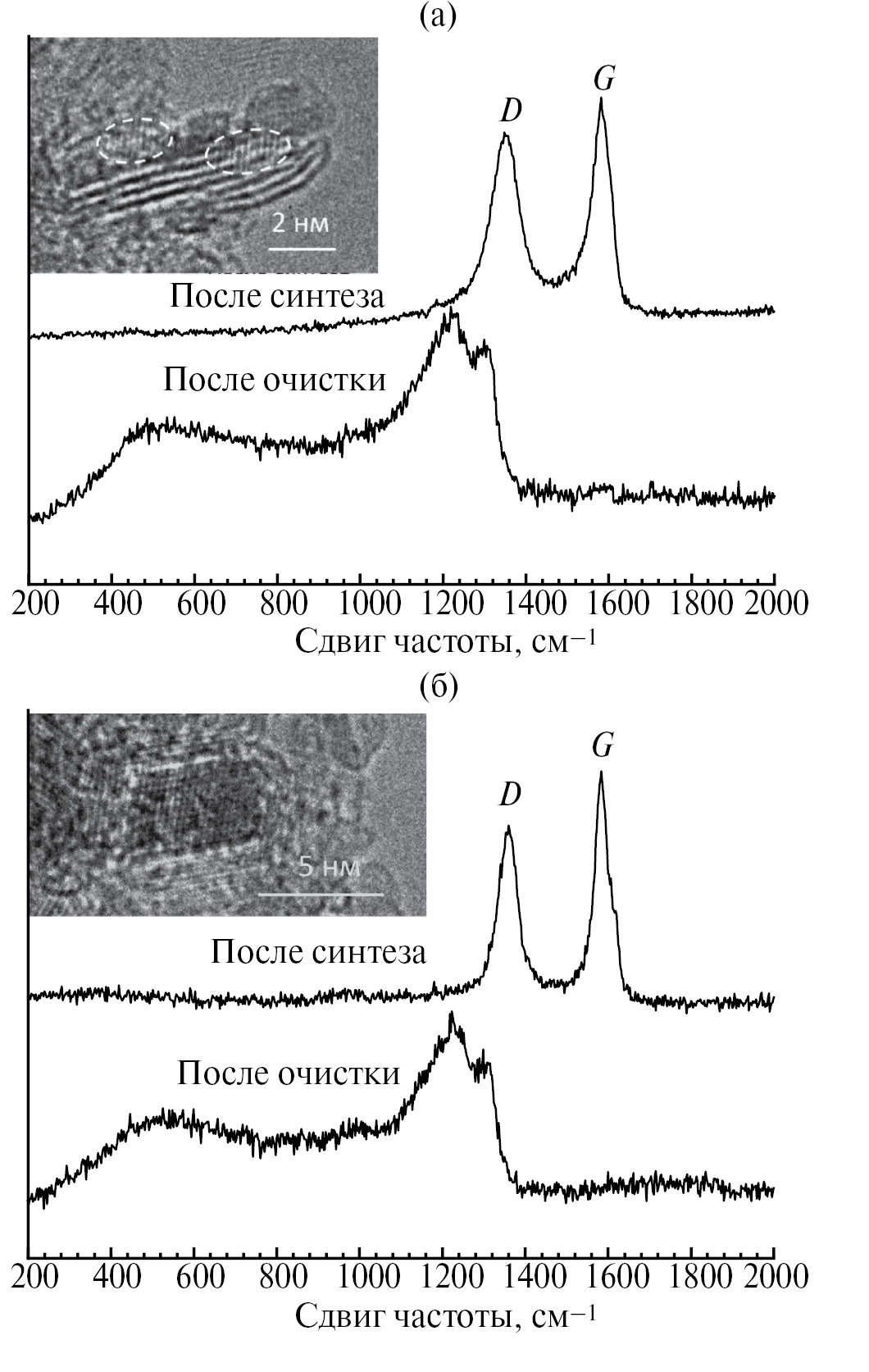 6. Рис. 5. Спектры КРС образцов, синтезированных при 1270 (а) и 1520 K (б) до и после очистки; на вставках ПЭМ-изображения микроструктуры образцов после синтеза.