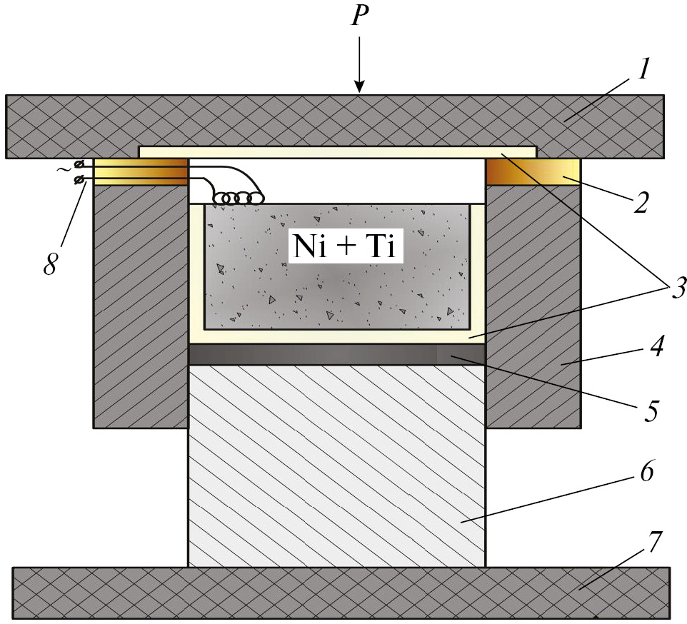3. Fig.2. Scheme of synthesis of a Ni+Ti mixture in a rigid mold: 1 - steel plate, 2 - intermediate insulating ring, 3 – asbestos heat insulator, 4 – steel matrix, 5 – graphite insert, 6 – punch, 7 – press table, 8 – initiating spiral.
