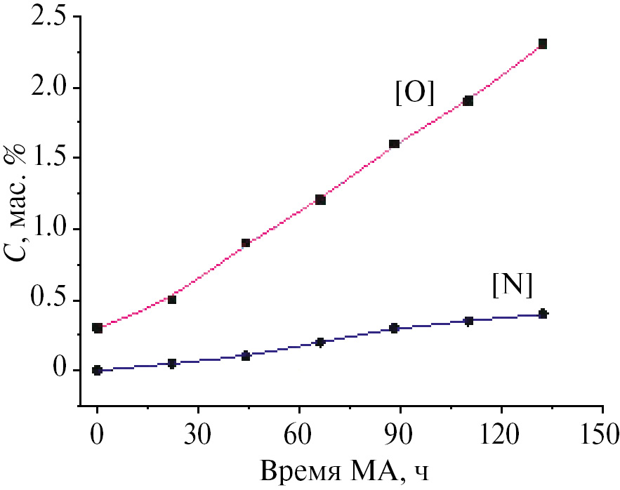 5. Fig. 4. Dependences of oxygen and nitrogen content in the Ni+Ti mixture on the MA time.