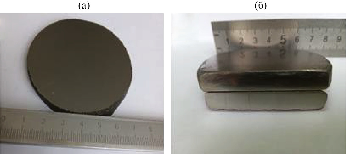 6. 5. Photographs of polished alloy samples 1 (a), 3 (b) (diameter 70 mm, thickness 8 mm).