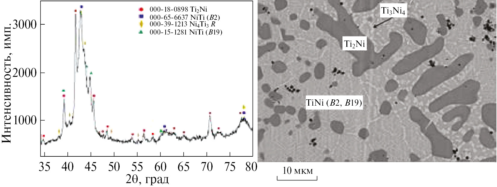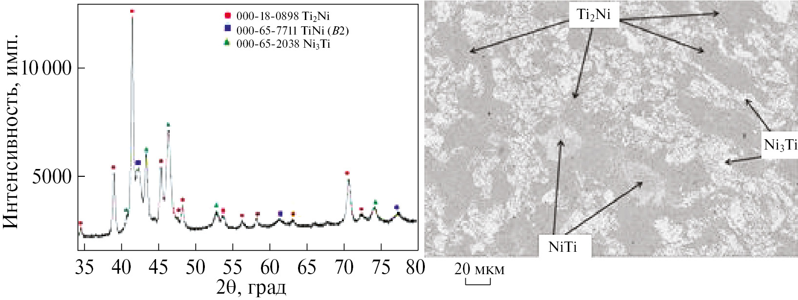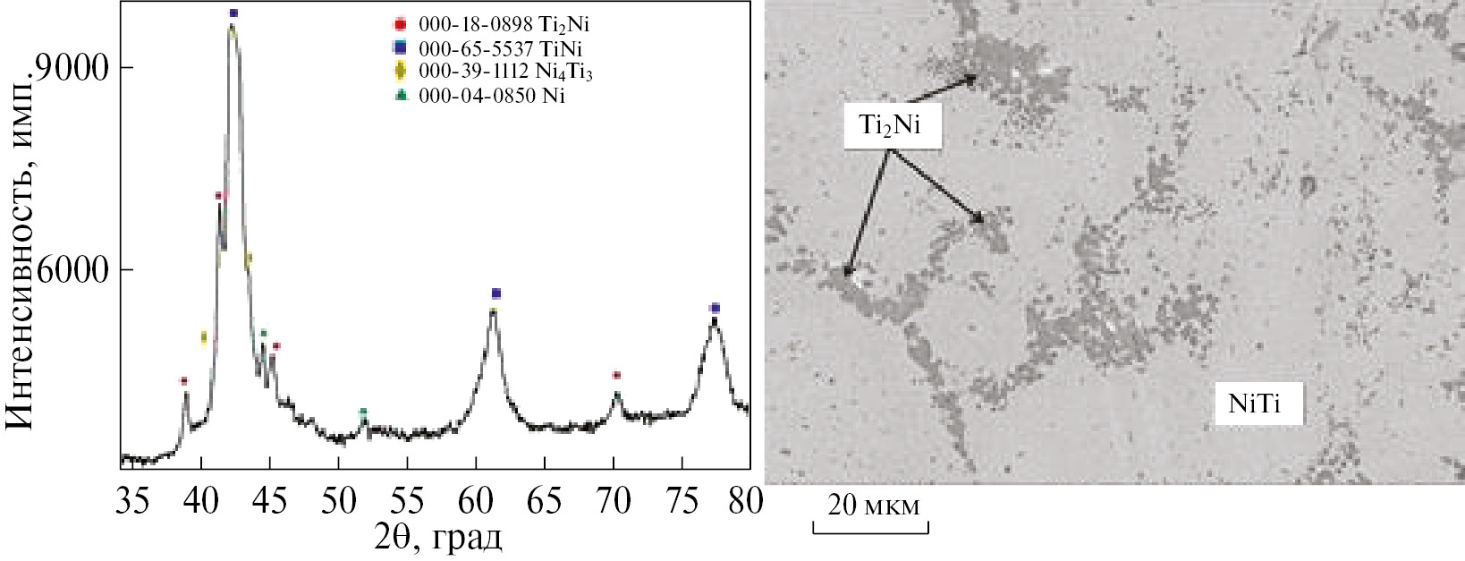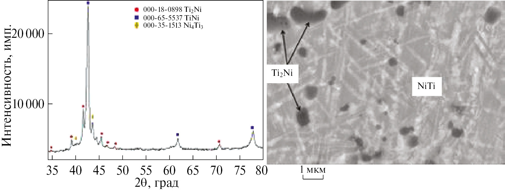 Авторами [14] показана возможность получения плотных образцов из никелида титана методом СВС-компактирования с использованием «химической печи» в качестве дополнительного источника тепла, повышающего начальную температуру синтеза. Основу в полученных сплавах составляли фазы Ti2Ni и TiNi, также присутствовали вторичные фазы Ni3Ti и Ni4Ti3.