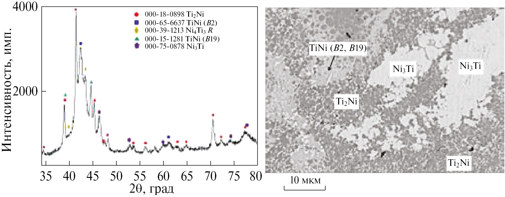 В сплавах 3 и 4, синтезированных из МА-смеси, содержалось максимальное количество фазы Ti2Ni (45.5 и 53.0 об.%, табл. 3). Микроструктура этих сплавов характеризуется наличием областей фаз Ti2Ni и Ni3Ti с размерами до 30 мкм (рис. 8). Увеличение температуры синтеза до 1400°С за счет использования ХП при синтезе сплава 4 из МА-смеси практически не повлияло на его фазовый состав (рис. 9), а содержание фазы Ti2Ni даже немного увеличилось. Это указывает на взаимосвязь фазового состава с концентрацией кислорода в исходной смеси. Увеличение концентрации кислорода (до 1.9 мас.%) в исходной смеси стабилизирует фазу Ti2Ni и уменьшает содержание TiNi в сплаве.