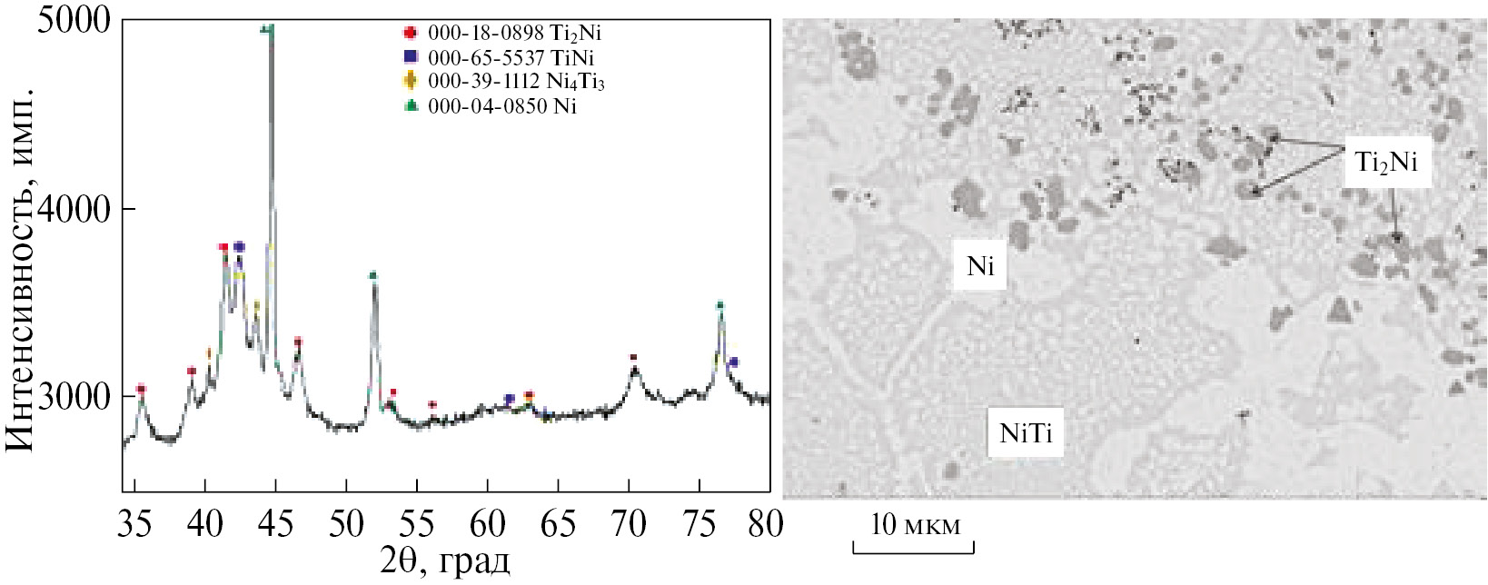 На рис. 6–12 представлены дифрактограммы и микрофотографии сплавов 1–7. Полученные данные указывают на формирование многофазных сплавов, содержащих интерметаллиды системы Ni–Ti (табл. 3). Несмотря на заложенный эквимолярный состав смеси Ni+Ti, времени нахождения образца при температуре, необходимой для протекания процессов диффузии и гомогенизации, недостаточно для формирования равновесного состава сплава. На рис. 6 представлены дифрактограмма и микроструктура сплава 1. Основной фазой, по данным РФА, является NiTi (~44.5 об.%, табл. 3). Также присутствуют Ti2Ni и Ni4Ti3. Наличие фазы NiTi (B19) иглообразной формы указывает на мартенситный переход фазы NiTi(В2) в NiTi(B19). При снижении температуры горения до 1250°С в сплаве 2, полученном с использованием ХМ меньшей массы, интенсивность рефлексов Ti2Ni увеличивается, а NiTi уменьшается (38 об.%, табл. 3) . В сплаве присутствуют крупные зерна фазы Ti2Ni (рис. 7).