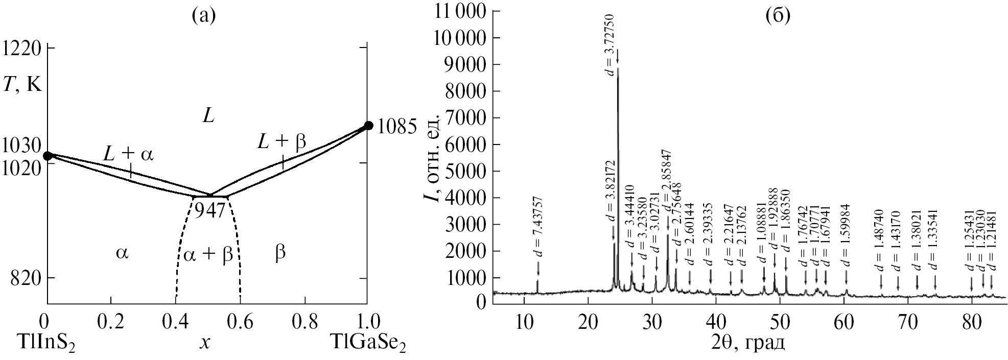 Рис. 1. Уточненная нами по данным ДТА и РФА фазовая диаграмма системы TlGaSe2–TlInS2 (а), рентгенограмма TlInS2 (б).