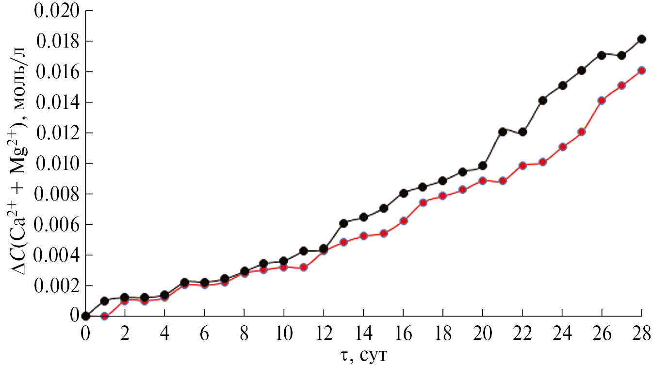 8. 7. Accumulation curves of Ca2+ and Mg2+ ions on the surface of HA tablets (red line), Thrust (black line) from SBF solution.