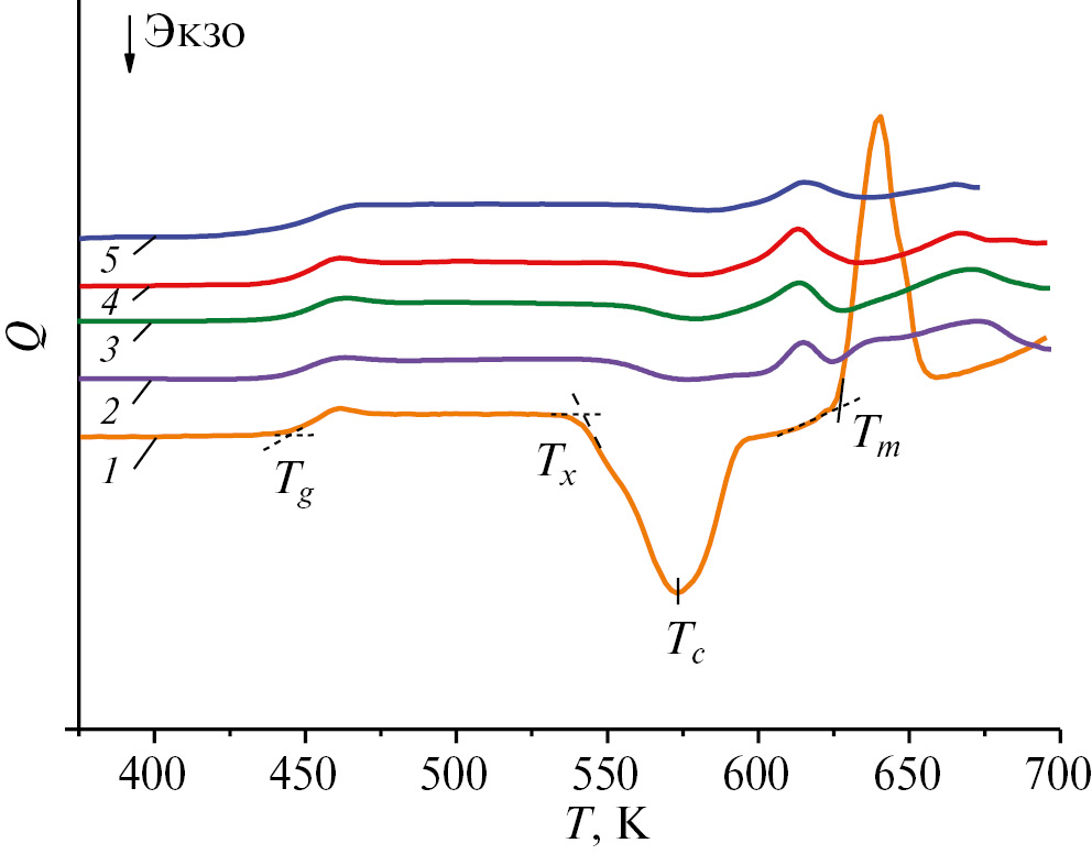 Характеристические температуры стекол. На кривых ДСК нагревания (рис. 1) исследуемых образцов обнаружены интервалы стеклования (расстекловывания), пики кристаллизации и плавления. Из положения указанных сигналов определены температура стеклования Tg, начала (Tx) и максимума (Tс) кристаллизации, начала плавления (Tm). Из значений характеристических температур рассчитаны общепринятые критерии кристаллизационной устойчивости [21]: