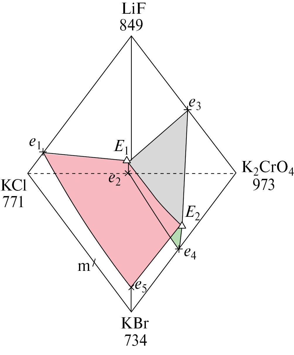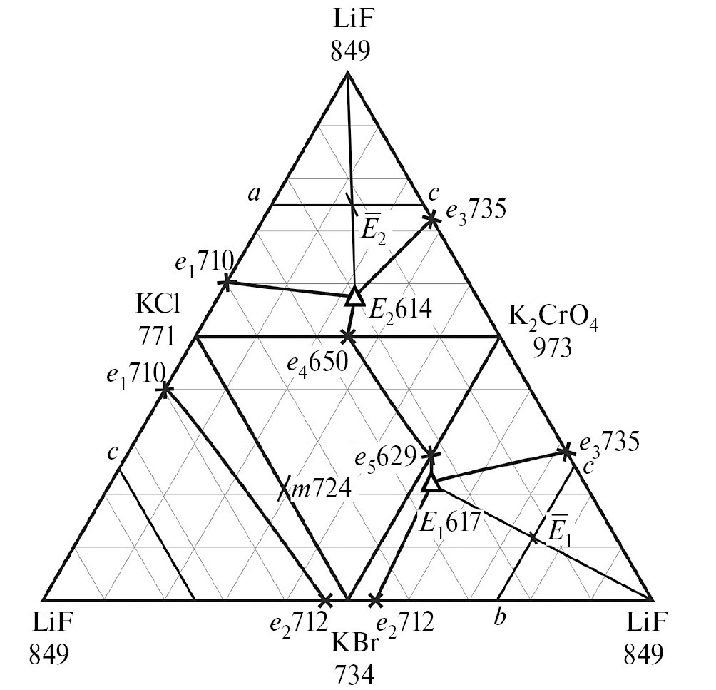 • Система LiF–KCl–K₂CrO₄ содержит эвтектику E2 с температурой плавления 614°С и составом 12% LiF +44% KCl + 44% α-K₂CrO₄. В системе зафиксирована кристаллизация трех фаз – LiF, KCl и α-K₂CrO₄ [18, 19].