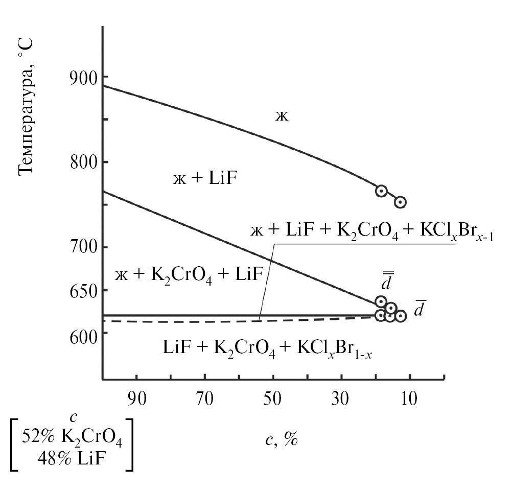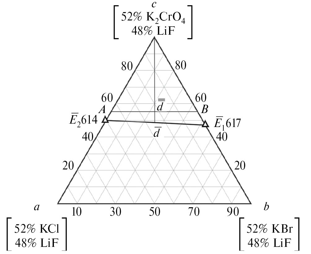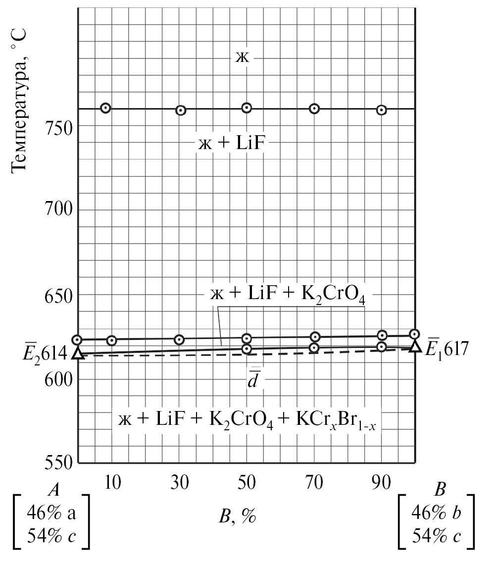 Исследованием двух политермических разрезов (рис. 4), LiF (рис. 5) выявили температуру плавления и состав сплава, отвечающего точке d, лежащей на моновариантной кривой E1E2: 616°С, 18% LiF + 42.6% K₂CrO₄ + 19.7% KCl + 19.7% KBr.