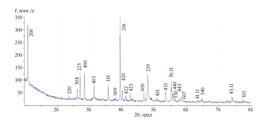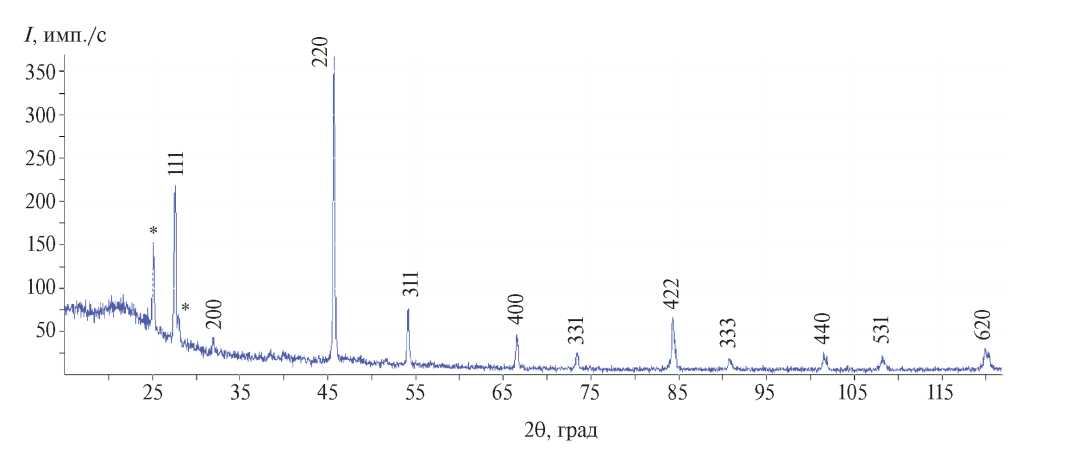 После удаления кристаллизационной воды дифрактограмма исследуемого образца состоит только из линий моносульфида натрия (рис. 3). Результаты индицирования дифрактограмм показали, что исследуемый образец имеет ГЦК-структуру с параметром решетки a = 6.5295 ± 10 Ǻ. Полученные нами рентгеновские данные хорошо согласуются с литературными [31].