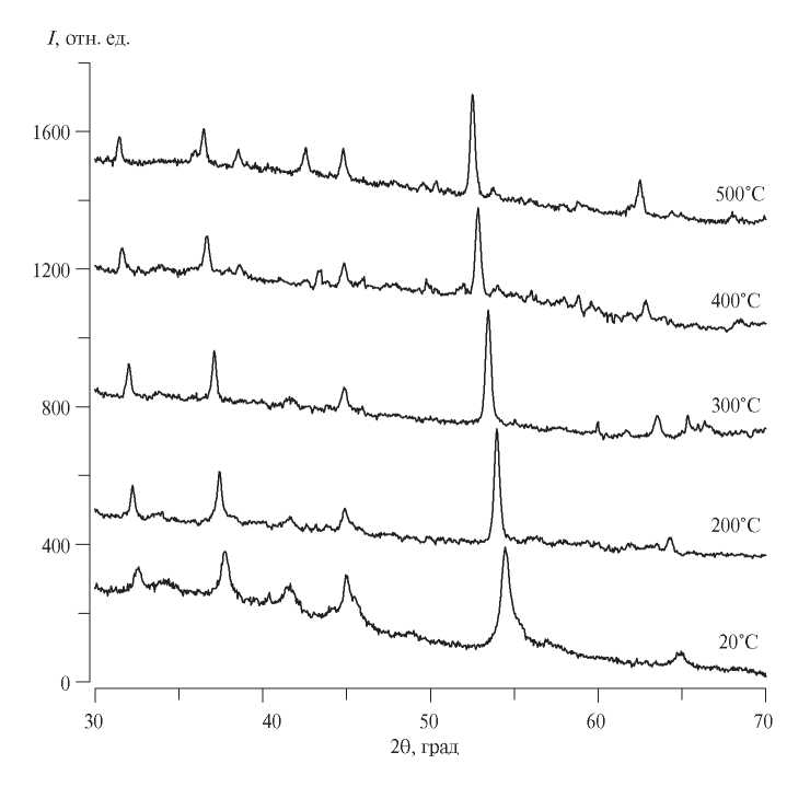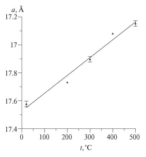 Примерно через 6 месяцев после синтеза в исследуемых образцах при комнатной температуре происходит самопроизвольный переход в фазу с ГЦК-структурой (рис. 5). В интервале от комнатной температуры до 500°С эти образцы сохраняют ГЦК-структуру, параметр решетки в зависимости от температуры меняется линейно (рис. 6). Коэффициент термического расширения составляет 7.53 × 10 −5 К−1. Из рис. 5 видно, что дифрактограммы ГЦК-фазы имеют широкие рефлексы. Мы полагаем, что уширение линий связано с малым размером ОКР новой ГЦК-фазы [30].