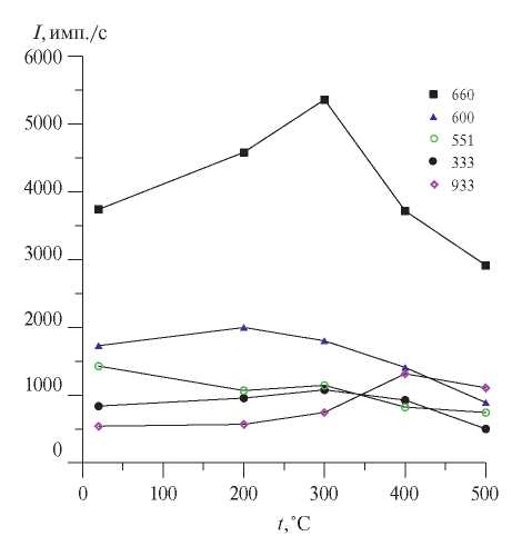 С целью уточнения особенностей структурных превращений были также изучены интегральные интенсивности дифракционных линий (рис. 9). Известно, что при отсутствии структурных превращений интенсивность дифракционных линий падает с повышением температуры вследствие тепловых колебаний атомов [30]. Однако, как видно из рис. 9, до температур 200–300°С наблюдается заметный рост интегральных интенсивностей линий. Данный температурный интервал хорошо согласуется с интервалом быстрого роста размеров ОКР и уменьшения ширины дифракционных линий. Поэтому мы полагаем, что рост интенсивности линий в этом температурном интервале связан с рекристаллизацией образцов, увеличением размеров ОКР и совершенствованием кристаллической структуры в результате отжига. Данный вклад в интегральную интенсивность в этом температурном интервале превышает вклад от температуры. При температурах выше ~300°С процессы рекристаллизации в основном завершаются и уменьшение интенсивности линий обусловлено только вкладом температурного фактора.