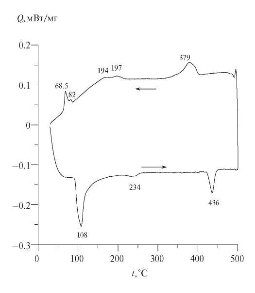 Для подтверждения фазовых превращений в исследуемых образцах были проведены ДСК-исследования. При нагреве на ДСК-кривых наблюдаются два высоких пика: при t1 = 108°С и t2 = 436°С, соответствующих эндотермическим превращениям (рис. 10). Эти превращения происходят без изменения типа кристаллической решетки, являются обратимыми и повторяются при охлаждении в области более низких температур. Из рис. 10 видно, что первое превращение начинается примерно при ~70оС и завершается при ~250°С. Этот температурный интервал также хорошо согласуется с интервалом, в котором наблюдаются сужение дифракционных линий, рост размеров ОКР и интенсивности линий.