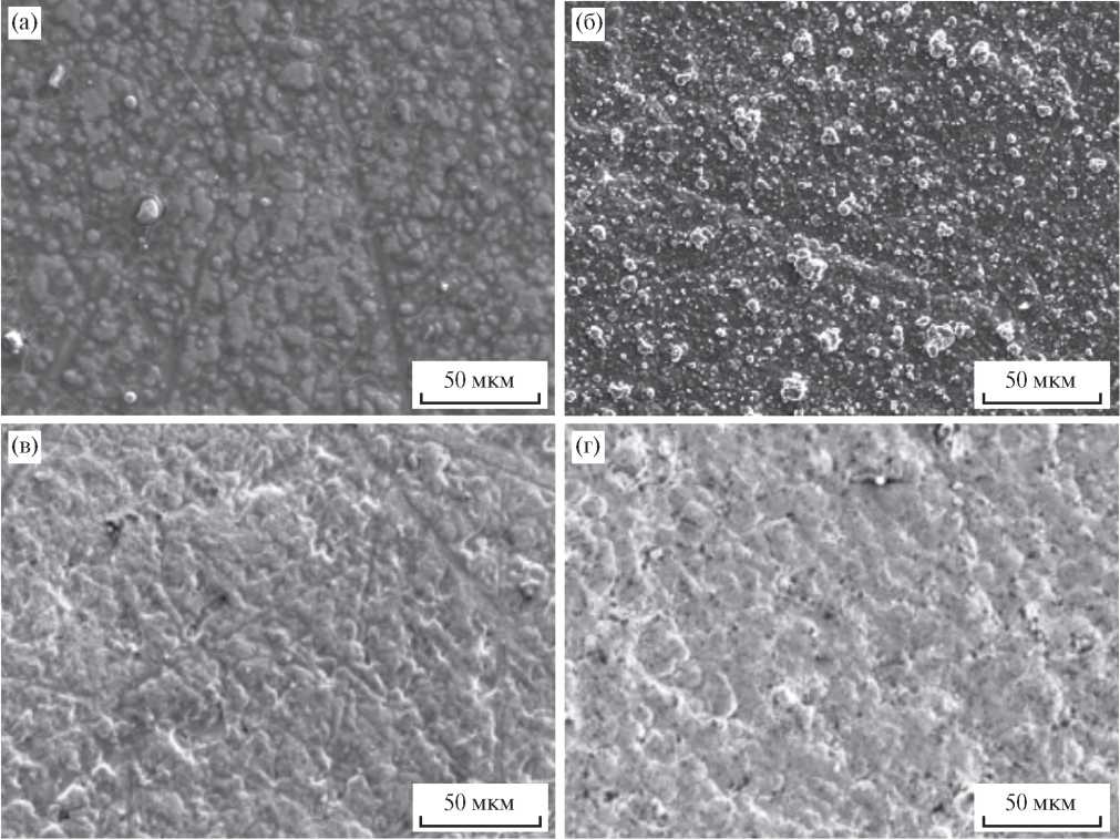 Рис. 1. РЭМ-изображения поверхности пленок Ni (a, б) и Co (в, г) с использованием в качестве катализатора напыленных Ni (a), Co (в), химически осажденного Pd (б, г).