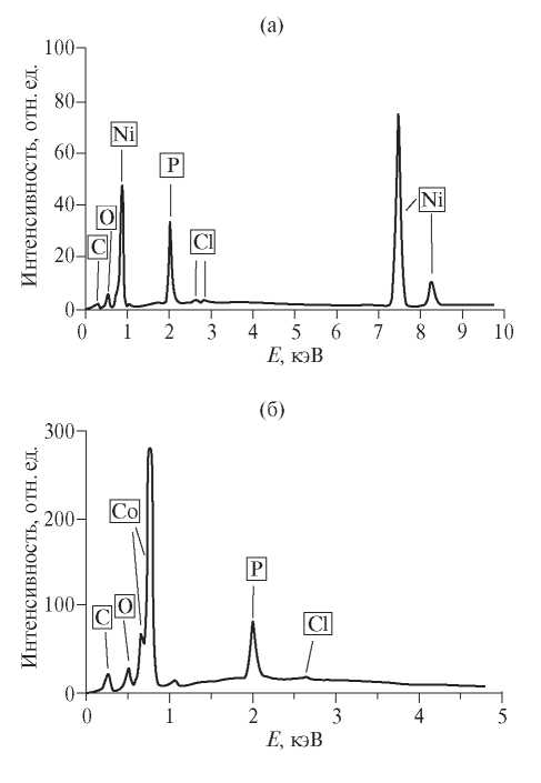Состав пленок, полученных химическим осаждением, определяли по энергодисперсионым диаграммам, которые представлены на рис. 2. Состав пленок представлен в табл. 3 и 4. Установлено, что при использовании в качестве катализаторов напыленных пленок в химически осажденных пленках содержится не менее 85 мас. % основного металла (Ni или Co). Содержание P составляет порядка 7–8 мас. %. При использовании Pd содержание основного металла несколько ниже, не менее 82 мас. %. При этом содержание P больше, порядка 9 мас. %.