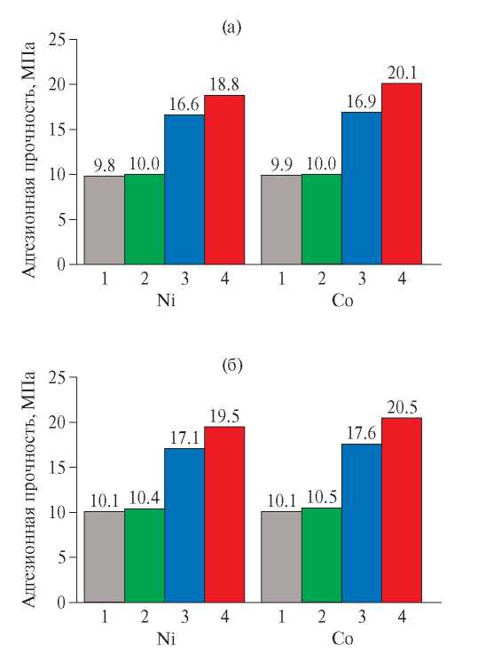 На рис. 3 представлены результаты измерения адгезионной прочности контактов при использовании катализаторов: 1 – напыленные Ni или Co (шероховатость 300 нм); 2 – Pd (шероховатость 300 нм); 3 – напыленные Ni или Co (шероховатость 700 нм); 4 – Pd (шероховатость 700 нм). Максимальные значения адгезионной прочности (18.8–19.5 МПа для Ni и 20.1–20.5 МПа для Co) получены при шероховатости поверхности 700 нм и использовании в качестве катализатора Pd. Полученные значения адгезионной прочности удовлетворяют требованиям, предъявляемым к контактам в ТЭ [2, 4, 6, 14] и соответствуют лучшим значениям для толстопленочных контактов [23, 25–28].