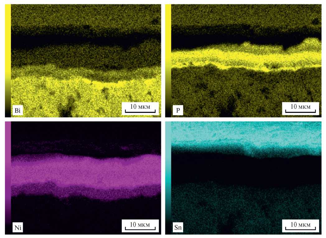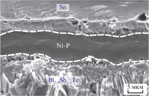 Для исследований барьерных свойств на поверхность контактов наносили лужением слои Sn. Затем образцы отжигали 30 ч при температуре 600 К и исследовали взаимную диффузию материалов. Для этого на образцах ТЭМ делали скол и находили распределение фаз в области контакта с использованием картирования. В качестве примера на рис. 4 и 5 представлены РЭМ-изображения скола и результаты картирования образца ТЭМ с химически осажденной пленкой Ni.
