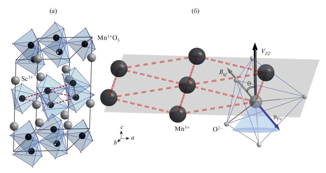 Рис. 1. Фрагмент кристаллической структуры гексагонального манганита ScMnO3, чередование слоев из тригональных бипирамид Mn3+O5 и катионов Sc3+ в элементарной ячейке (а); cхематическое изображение локальной структуры тригональной бипирамиды, где показаны направления сверхтонкого магнитного поля Hhf и магнитного момента µFe на ядрах 57Fe, а также основной компоненты VZZ тензора градиента электрического поля (б).