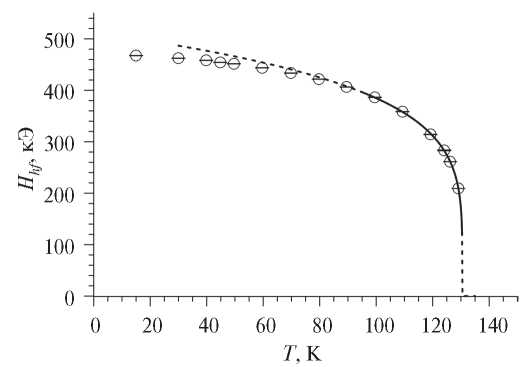 На рис. 4 приведена температурная зависимость сверхтонкого магнитного поля Hhf(T), аппроксимированная степенной функцией вида D∙(1 − T/T0)β c параметрами D = 0.91(1) и β = 0.197(3), которые отражают установление 3D-изотропного магнитного упорядочения [17, 18].