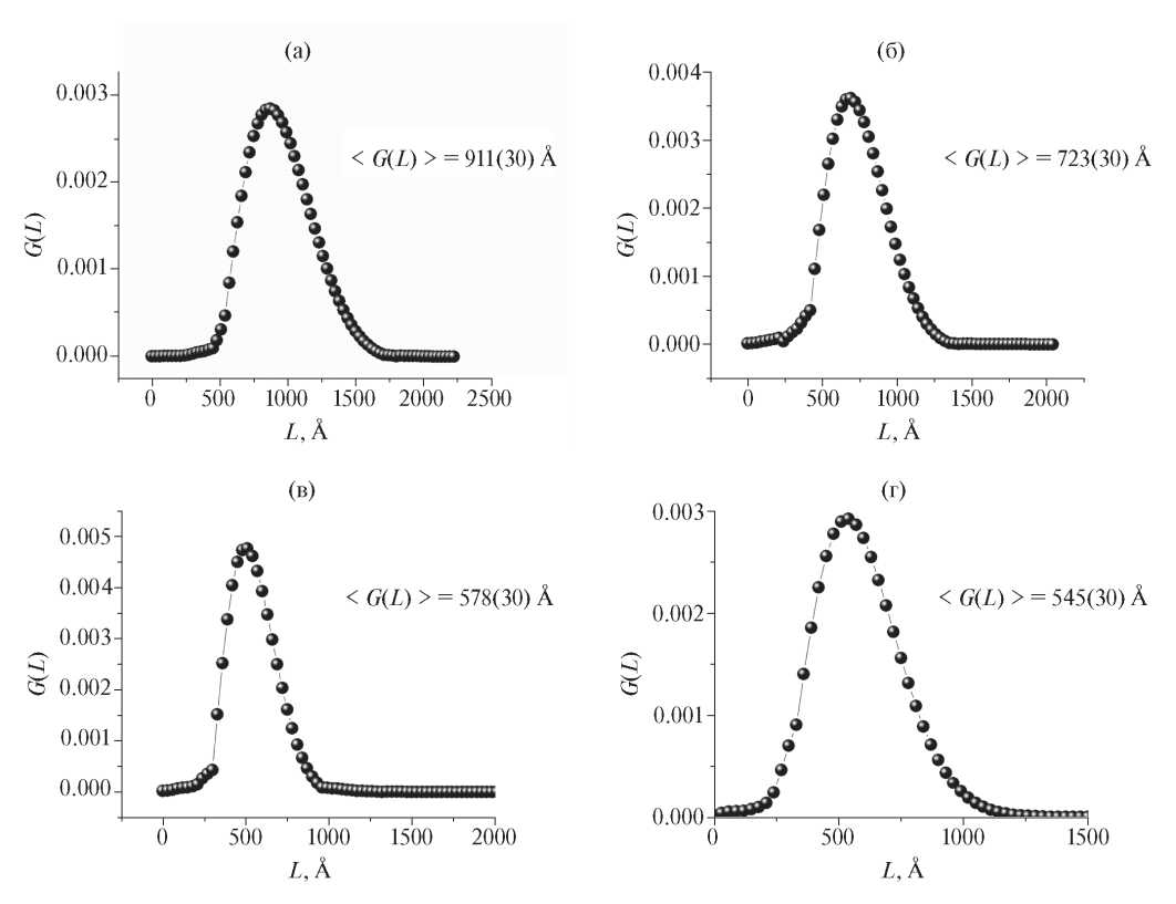 Взвешенные по объему функции распределения кристаллитов по размерам G(L) вдоль [100] приведены на рис. 2. Характерной особенностью всех полученных распределений по размерам является их унимодальность с отсутствием заметного вклада предельно малых кристаллитов. В большинстве случаев такое распределение можно объяснить сходным механизмом образования частиц в процессе твердофазного синтеза и оптимальным режимом кристаллизации. Вместе с тем, увеличение содержания цирконата стронция в образцах приводит к заметному уменьшению среднего размера ОКР от 911 Å (а) до 723 Å (б), 554 Å (в) и 545 Å (г).