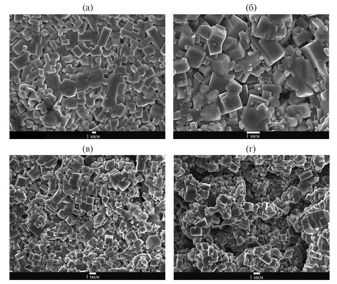 Микроструктуру образцов KNN–SZ исследовали методом растровой электронной микроскопии высокого разрешения. Установлено, что образцы состоят преимущественно из зерен кубической формы (рис. 3). Форма кристаллитов из рентгендифракционного анализа определялась по трем рефлексам: 100, 110 и 111. Этого было недостаточно, чтобы сделать вывод о форме кристаллитов. Однако полученные размеры вдоль этих направлений позволяют предположить изометричность формы исследованных кристаллитов, что согласуется с данными электронной микроскопии. Изученные образцы характеризуются плотной упаковкой зерен. Уплотнение образцов, полученных с использованием добавки оксида цинка, оценивали по результатам измерения усадки. Выявлено увеличение усадки образцов, модифицированных ZnO, на ~10–15% в сравнении с немодифицированными образцами. Керамика базового состава ниобата калия-натрия состоит из зерен размером ~2–5 мкм (рис. 3а). Заметное различие размеров ОКР и кристаллитов, по-видимому, обусловлено блочной структурой кристаллитов.